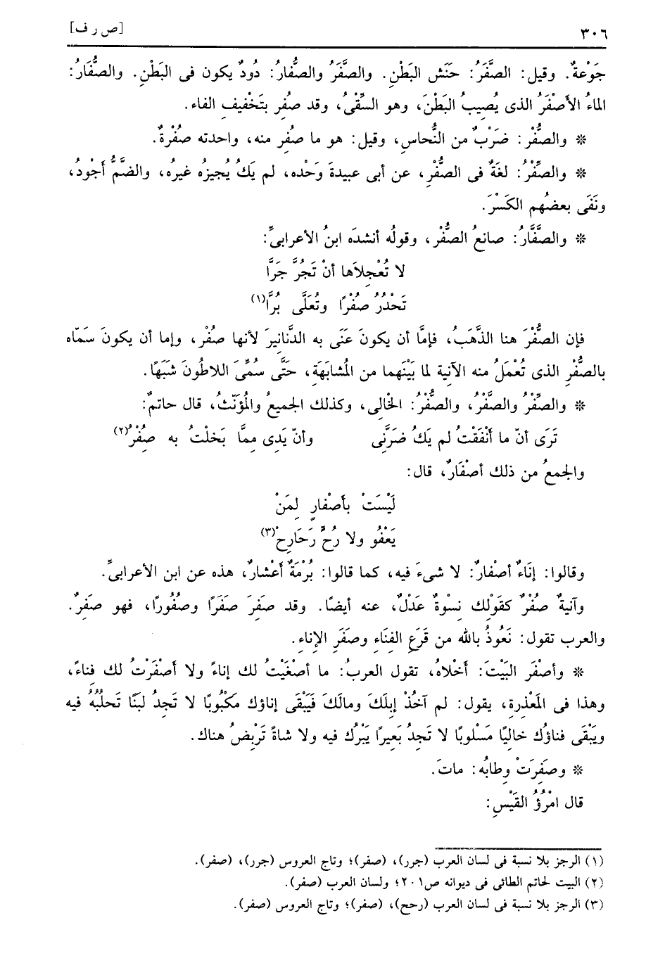 فإن الصُّفْرَ هنا الذَّهَبُ فإمَّا أن يكونَ عَنَى به الدَّنانِيرَ لأنها صُفْر وإما أن يكونَ سَمّاه بالصُّفْرِ الذي تُعْمَلُ منه الآنِية لما بَيْنَها من المُشابَهَةِ حَتَّى سُمِّيَ اللاطُونَ شَبَهاً والصِّفْرُ والصَّفْرُ والصُّفْرُ الْخالِي وكذلك الجميعُ والمُؤَنّثُ قال حاتمٌ