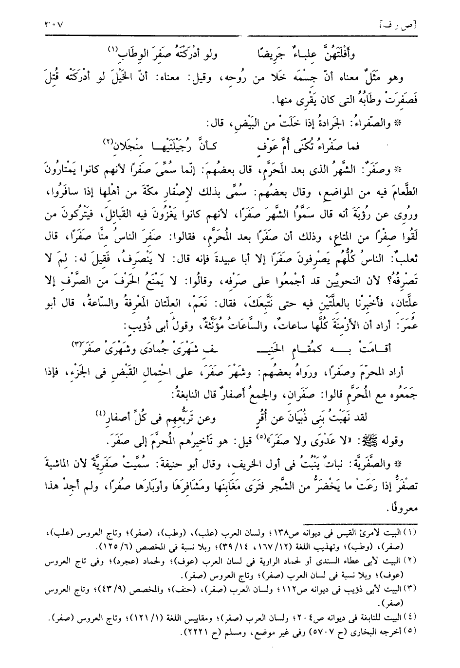 أراد المحرّمَ وصَفراً ورَواهُ بعضُهم وشَهْرَ صَفَرَ على احْتِمالِ القَبْضِ في الجَزْءِ فإذا جَمَعُوه مع المُحَرَّمِ قالوا صَفَرانِ والجمعُ أَصفارٌ قال النابغةُ