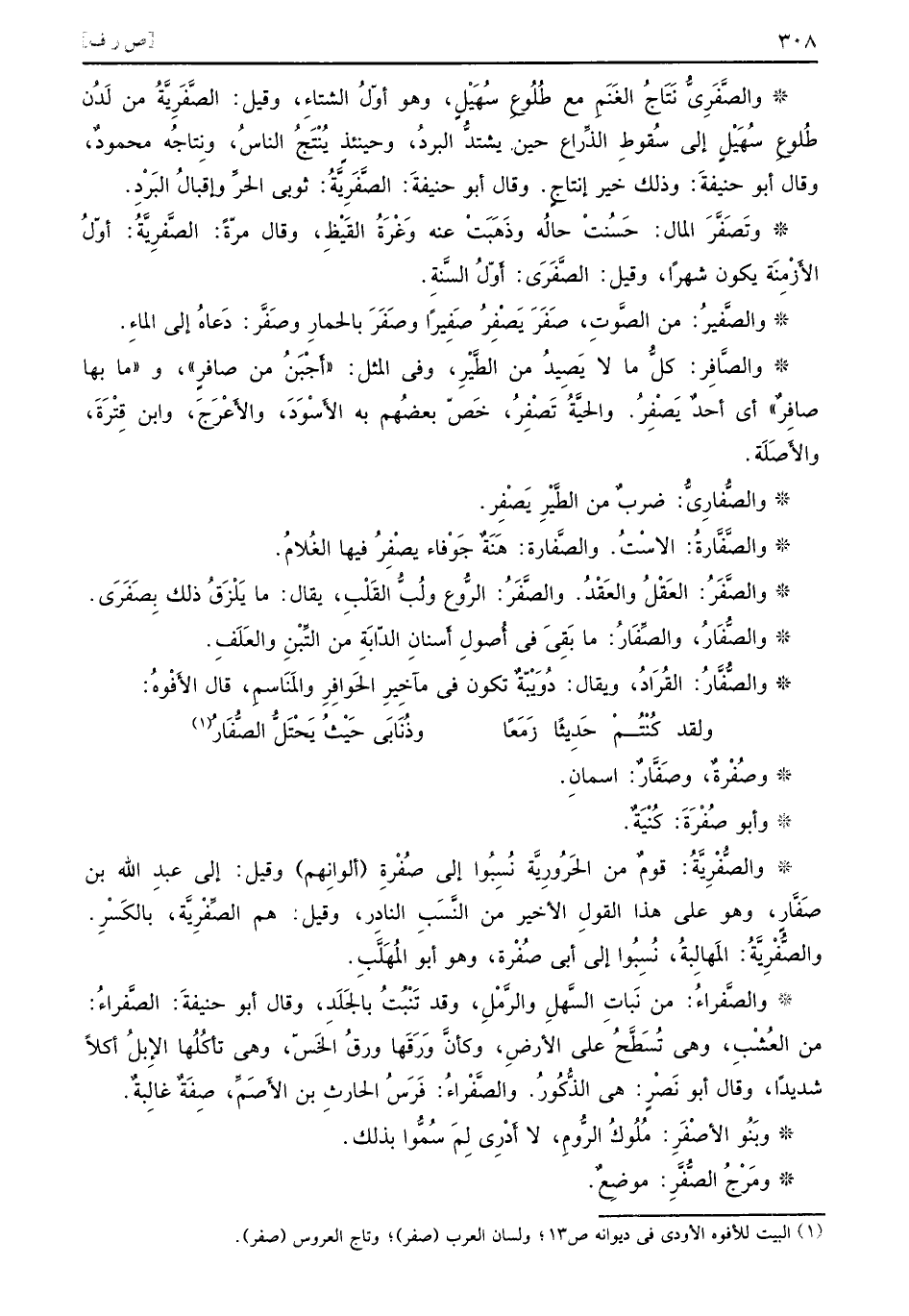 والصَّفَرِيُّ نَتَاجُ الغَنَمِ مع طُلُوعِ سُهَيْلٍ وهو أوّلُ الشتاءِ وقيل الصَّفَرِيَّةُ من لَدُن طُلوعِ سُهِيْلٍ إلى سُقوطِ الذِّراع حين يشتدُّ البردُ وحينئذٍ يُنْتَجُ الناسُ ونِتاجُه محمودٌ وقال أبو حنيفةَ وذلك خير إنتاجٍ وقال أبو حنيفةَ الصَّفَرِيَّةُ ثوبي الحرِّ وإقبالُ البَرْدِ وتَصَفَّرَ المال حَسُنتْ حالُه وذَهَبَتْ عنه وَغْرَةُ القَيْظِ وقال مرّةً الصَّفرِيَّةُ أوّلُ الأَزْمِنَة يكون شهراً وقيل الصَّفَرَى أَوّلُ السَّنةِ والصَّفِيرُ من الصَّوتِ صَفَرَ يَصْفِرُ صَفِيراً وصَفَرَ بالحمارِ وصَفَّر دَعاهُ إلى الماءِ والصَّافِرُ كلُّ ما لا يَصِيدُ من الطَّيْرِ وفي المثل أَجْبَنُ من صافِرٍ وما بها صافِرٌ أي أحدٌ يَصْفِرُ والحيَّةُ تَصْفِرُ خَصّ بعضُهم به الأَسْوَدَ والأَعْرَجَ وابن قِتْرَةَ والأَصَلَة والصُّفارِيُّ ضربٌ من الطَّيْرِ يَصْفِر والصَّفَّارةُ الاسْتُ والصَّفارة هَنَةٌ جَوْفاء يصْفِرُ فيها الغُلامُ والصَّفَرُ العَقْلُ والعَقْدُ والصَّفَرُ الرُّوع ولُبُّ والقَلْبِ يقال ما يَلْزَقُ ذلك بِصَفَرَى والصُّفَارُ والصِّفَارُ ما بَقِيَ في أُصولِ أَسنانِ الدّابَةِ من التِّبْنِ والعَلَفِ والصُّفَّارُ القُرَادُ ويقال دُوَيْبَةٌ تكون في مآخِيرِ الحَوافِرِ والمَنَاسمِ قال الأَفْوهُ