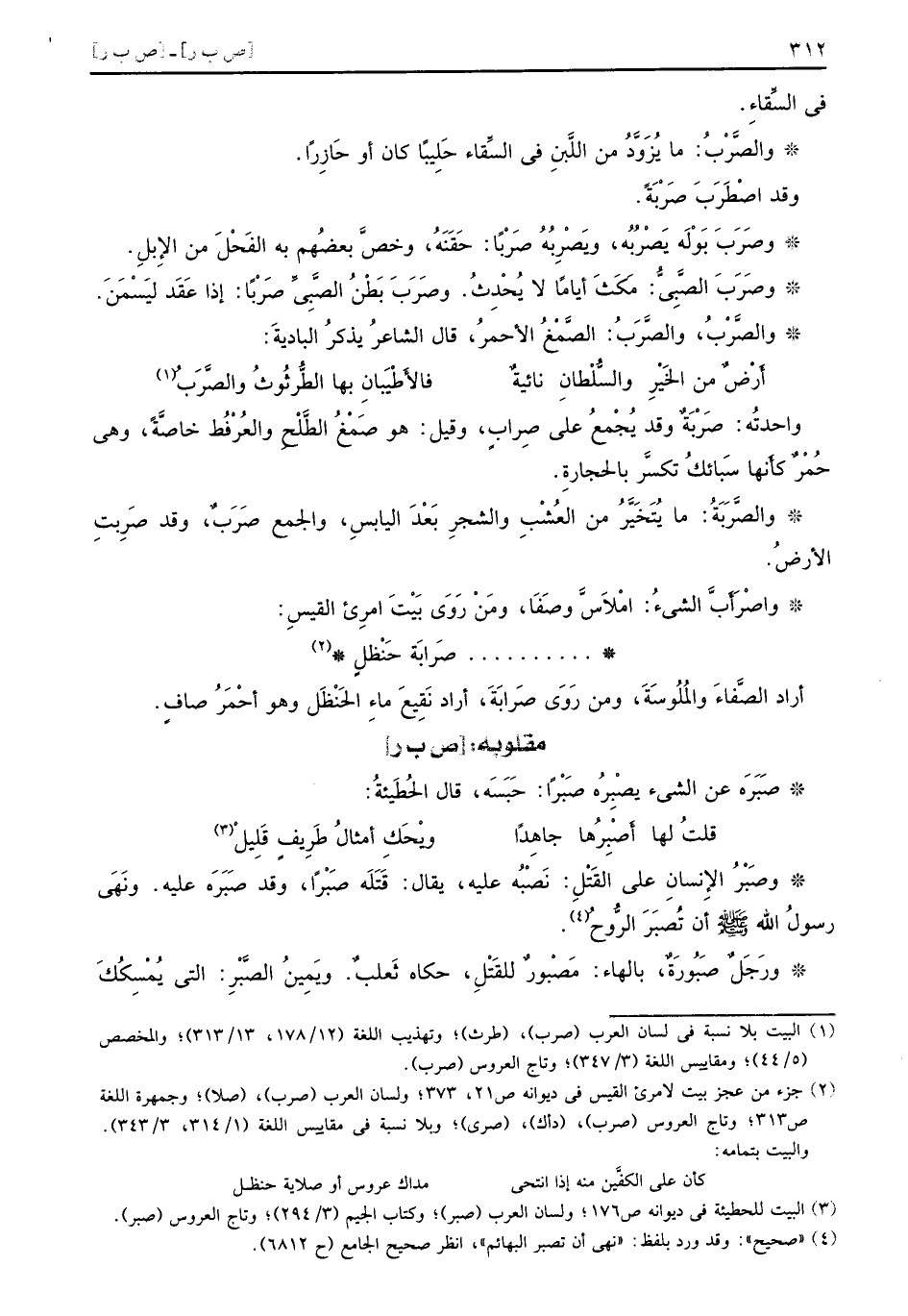 واحدتُه صَرْبَةٌ وقد يُجْمَعُ على صِرابٍ وقيل هو صَمْغُ الطَّلْحِ والعُرْفُط خاصَّةً وهي حُمْرٌ كأَنها سبَائكُ تكسَّر بالحجارةِ والصَّرَبَةُ ما يُتَخَيَّرُ من العُشْبِ والشجرِ بَعْدَ اليابسِ والجمع صَرَبٌ وقد صَرِبتِ الأرضُ واْصْرَأَبَّ الشيءُ امْلاَسَّ وصَفَا ومَنْ رَوَى بَيْتَ امرِئ القيسِ