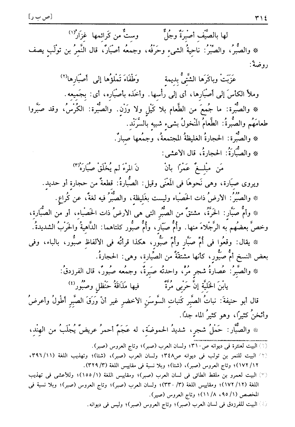 ويروى صِبَارة وهي نَحوَها في المَعْنَى وقيل الصُّبارةُ قِطعةٌ من حجارةٍ أو حديدٍ والصُبُرُ الأرضُ ذات الحَصْباء وليست بغَلِيظةٍ والصُّبْرُ فيه لغةٌ عن كُراعٍ وأمُّ صَبَّارٍ الحَرَّةُ مشتقٌ من الصُّبُرِ التي هي الأرضُ ذات الحَصْباءِ أو من الصُّبَارةِ وخصَّ بعضُهم به الرَّجْلاءَ منها وأُمُّ صَبّارٍ وأُمُّ صبُّور كلتاهما الدَّاهِيةُ والحَرْبُ الشديدةُ يقال وقعُوا في أُمِّ صَبَّارٍ وأُمِّ صَبُّورٍ هكذا قرأتُه في الألفاظِ صبُّور بالباء وفي بعض النسخ أمُّ صَبُّورٍ كأنها مشتقةٌ من الصِّيارةِ وهي الحجارةُ والصَّبِرُ عُصارةُ شجرٍ مُرٍّ واحدتُه صَبِرةٌ وجمعُه صُبورٌ قال الفرزدقُ