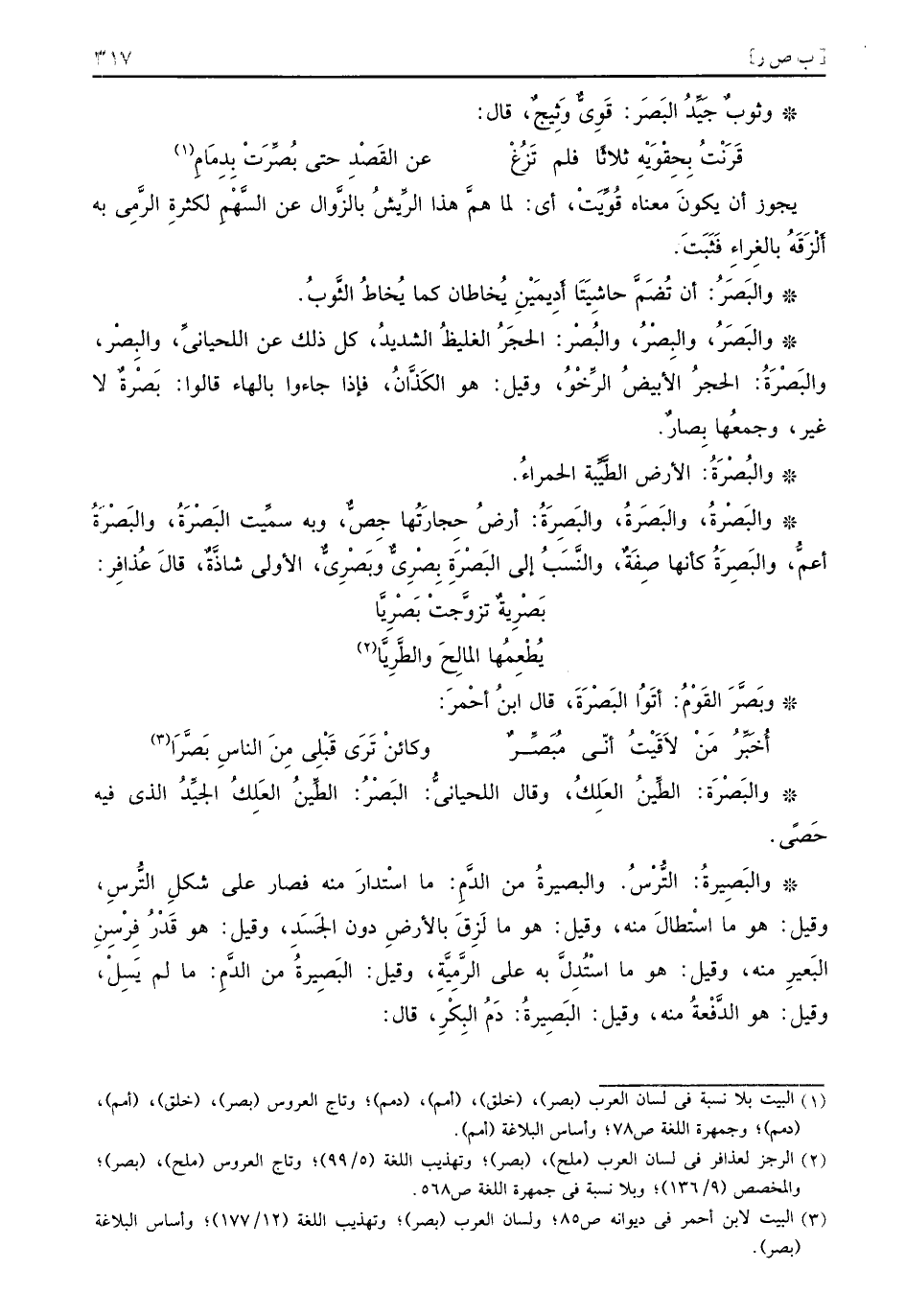 يجوز أن يكونَ معناه قُوِّيَتْ أي لما همَّ هذا الرِّيشُ بالزَّوال عن السَّهْمِ لكثرةِ الرَّمِي به أَلْزَقَهُ بالغِراءِ فَثَبَتَ والبَصَرُ أن تُضَمَّ حاشِيَتَا أَدِيمَيْنِ يُخاطان كما يُخاطُ الثَّوبُ والبَصَرُ والبِصْرُ والبُصْر الحجَرُ الغليظُ الشديدُ كل ذلك عن اللحيانيِّ والبِصْر والبَصْرَةُ الحجرُ الأبيضُ الرِّخْوُ وقيل هو الكَذَّانُ فإذا جاءوا بالهاء قالوا بَصْرةٌ لا غير وجمعُها بِصارٌ والبُصْرَةُ الأرض الطَّيِّبة الحمراءُ والبَصْرةُ البَصَرةُ والبَصِرَةُ أرضُ حِجارَتُها جِصٌّ وبه سمِّيت البَصْرَةُ والبَصْرَةُ أعمُّ والبَصِرَةُ كأنها صِفَةٌ والنَّسَبُ إلى البَصْرَةِ بِصْرِيٌّ وبَصْرِيٌّ الأولى شاذَّةٌ قال عُذافِر