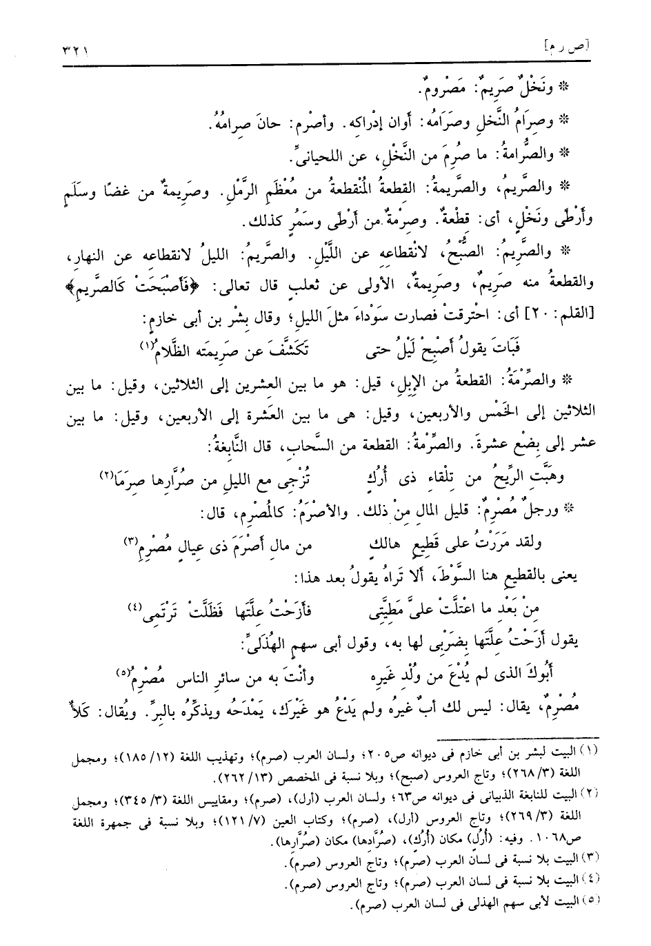 ونَخْلٌ صَرِيمٌ مَصْرومٌ وصِرَامُ النَّخلِ وصَرَامُه أَوان إدراكِه وأصْرم حانَ صِرامُهُ والصُّرامةُ ما صُرِمَمن النَّخْلِ عن اللحيانيِّ والصَّريمُ والصَّريمةُ القِطعةُ المُنْقطعةُ من مُعْظَمِ الرَّمْلِ وصَرِيمةٌ من غضّا وسَلَمٍ وأَرْطىً ونَخْلٍ أي قِطْعةٌ وصِرْمةٌ من أَرْطىً وسَمُرٍ كذلك والصَّرِيمُ الصُّبْحُ لانْقطاعِهِ عن اللَّيْلِ والصَّريمُ الليلُ لانقطاعهِ عن النهارِ والقطعةُ منه صَرِيمٌ وصَرِيمةٌ الأولى عن ثعلبٍ قال تعالى {فأصبحت كالصريم} القلم 20 أي احترقت فصارت سَوْداءَ مثلَ الليلِ وقال بِشْر بن أبي خازمٍ