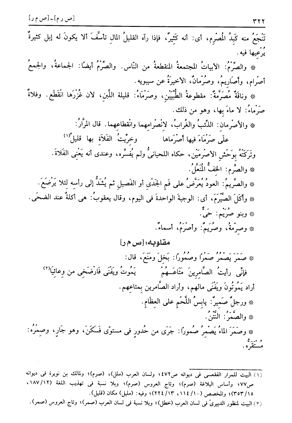 تَنْجَمعُ منه كَبِدُ المُصْرِم أي أنه كَثِيرٌ فإذا رآه القليلُ المالِ تأسَّفَ ألا يكونَ له إبل كثيرةٌ يُرْعِيها فيه والصِّرْمُ الأبياتُ المجتمعةُ المنقطعةُ من النّاس والصِّرْمُ أيضاً الجماعةُ والجمعُ أصرام وأَصَاريمٌ وصُرْمانٌ الأخيرَةُ عن سيبويه وناقَةٌ مُصَرَّمةٌ مقطوعةُ الطُّبْيَيْنِ وصَرْمَاءُ قليلة اللَّبنِ لأن غُزْرَها انْقَطَع وفلاةٌ صَرْماءُ لا ماءَ بِها وهو من ذلك والأَصْرمانِ الذِّئبُ والغُرابُ لانْصرامِهما وانقطاعِهما قال المرَّارُ