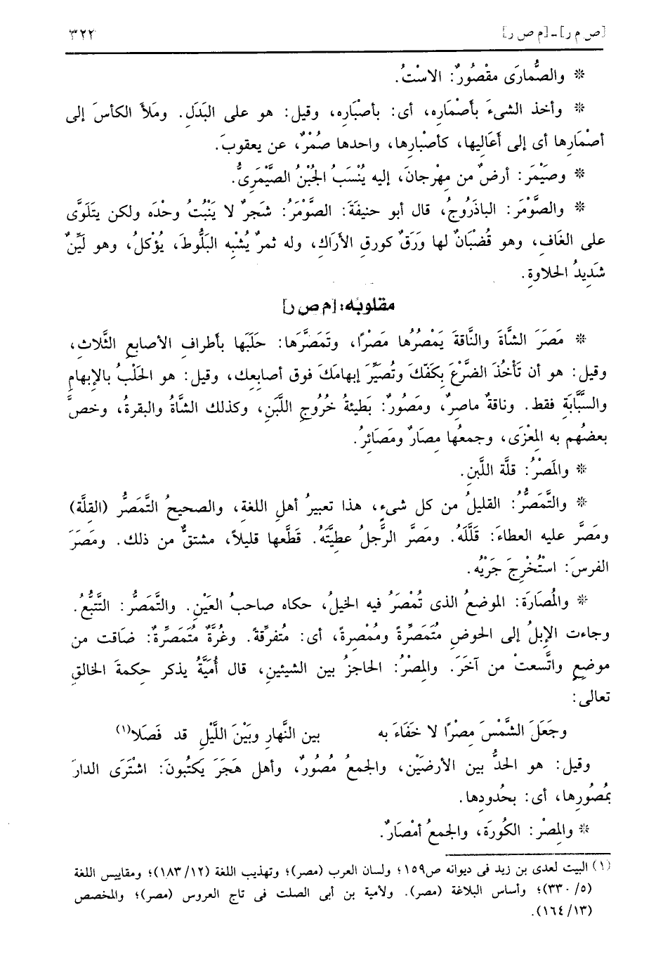 وقيل هو الحدُّ بين الأرضَيْن والجمعُ مُصُورٌ وأهل هَجَرَ يَكتُبونَ اشْتَرَى الدارَ بُمصُورِها أي بحُدودِها والمَصْر الكُورَة والجمعُ أمْصَارٌ