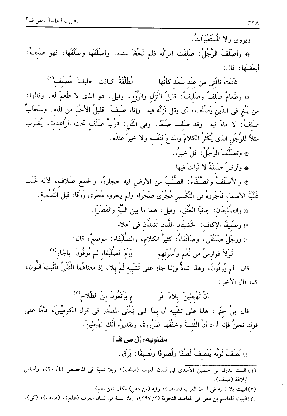 وطَعامٌ صَلِفٌ وصَلِيفٌ قليلُ النَّزَلِ والرَّبْعِ وقيل هو الذي لا طَعْمَ له وقالوا من يَبْغِ في الدّينِ يَصْلَف أي يقل نَزَلُه فيه وإناء صَلِفٌ قليلُ الأَخْذِ من الماءِ وسَحَابٌ صَلِفٌ لا ماءَ فيه وقد صَلِفَ صَلَفاً وفي المَثَلِ رَبَّ صَلَفٍ تحت الرَّاعِدِة يُضْرب مثلاً للرَّجُلِ الذي يُكْثرُ الكلامَ والمدحَ لِنَفْسِه ولا خيرَ عندَه وتصَلَّفَ الرَّجُلُ قلَّ خيرُه وأرضٌ صَلِفَةٌ لا نَباتَ فيها والأَصْلَفُ والصَّلْفَاءُ الصُّلْبُ من الأرضِ فيه حجارةٌ والجمع صَلافٍ لأنه غَلَب غَلَبَةَ الأسماءِ فأَجْروهُ في التَكْسيرِ مُجْرَى صَحْراء ولم يجروه مُجْرَى وَرْقَاء قبل التَّسْميةِ والصَّلِيفَانِ جانَبا العُنُقِ وقيل هما ما بين اللَّبَّةِ والقَصَرَةِ وصَلِيفَا الإِكافِ الخَشبتَانِ اللَّتانِ تُشدَّانِ في أعلاه ورجَلٌ صَلَنْفَي وصَلَنْفَاءُ كثيرُ الكلامِ والصُّلَيْفاء موضعٌ قال