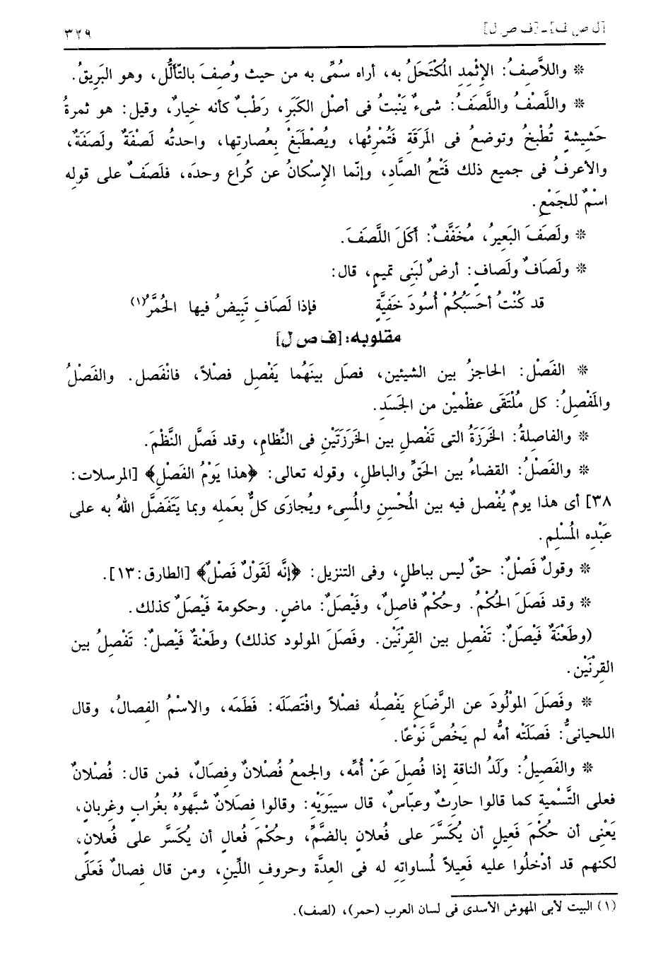 الفَصْل الحاجزُ بين الشيئين فصَل بينَهُما يَفْصِل فصْلاً فانْفَصل والفَصْلُ والمَفْصِلُ كل مُلْتَقَى عظْميْن من الجَسَدِ والفاصِلةُ الخَرَزَةُ التي تَفْصلِ بين الخَرَزَتَيْنِ في النِّظامِ وقد فَصَّل النَّظْمَ والفَصْلُ القضاءُ بين الحَقِّ والباطلِ وقوله تعالى {هذا يوم الفصل} المرسلات 38 أي هذا يومٌ يُفْصل فيه بين المُحْسِنِ والمُسْيء ويُجازَى كلٌّ بعَملِه وبما يَتَفَضَّل اللهُ به على عَبْدِه المُسْلِم وقولٌ فَصْلٌ حقٌ ليس بباطلٍ وفي التنزيل {إنه لقول فصل} الطارق 13 وقد فَصَلَ الحُكْمُ وحُكْمٌ فاصِلٌ وفَيْصَلٌ ماضٍ وحكومة فَيْصَلٌ كذلك وطَعْنَةٌ فَيْصَلٌ تَفْصِل بين القِرْنَيْن وفَصَلَ المولود كذلك وطَعْنةٌ فَيْصلٌ تَفْصِلُ بين القِرْنَيْن وفَصَلَ الموْلُودَ عن الرَّضَاعِ يَفْصِلُه فصْلاً وافْتَصَلَه فَطَمَه والاسْمُ الفِصالُ وقال اللحيانيُّ فَصَلَتْه أمُّه لم يَخُصَّ نَوْعاً والفَصِيلُ وَلَدُ الناقةِ إذا فُصِلَ عَنْ أُمِّه والجمعُ فُصْلانٌ وفِصَالٌ فمن قال فُصْلانٌ فعلى التَّسْميةِ كما قالوا حارِثٌ وعبّاسٌ قال سيبَوَيْه وقالوا فِصَلانٌ شبَّهُوهُ بغُرابٍ وغِربانٍ يَعْنِي أن حُكْمَ فَعِيلٍ أن يُكْسَّرَ على فُعلانٍ بالضَّمِّ وحُكْمَ فُعالٍ أن يُكَسَّر على فُعلانٍ لكنهم قد أدخلُوا عليه فَعِيلاً لمُساواتِهِ له في العِدَّة وحروفِ اللِّينِ ومن قال فِصالٌ فَعَلَى