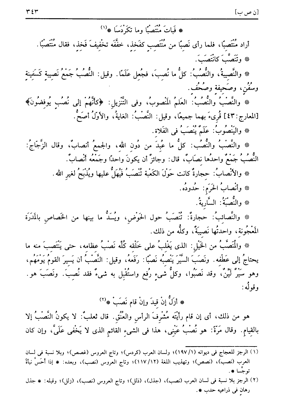 أراد مُنْتَصِباً فلما رأى نَصِباً من مُنْتَصِبٍ كفَخِذٍ خفَّفَه تخْفِيفَ فَخِذٍ فقال مُنْتَصْباً وتَنَصَّبَ كانْتَصَبَ والنَّصِيبةُ والنُّصُبُ كلُّ ما نُصِبَ فجُعِلَ عَلَماً وقيل النُّصُبُ جَمْعُ نَصِيبةٍ كَسَفِينةٍ وسُفُنٍ وصَحِيفَةٍ وصُحُفٍ والنَّصْبُ والنُّصُبُ العَلمُ المَنْصوبُ وفي التَّنْزيلِ {كأنهم إلى نصب يوفضون} المعارج 43 قُرِئَ بهما جميعاً وقيل النَّصْبُ الغايةُ والأَوّلُ أصَحُّ واليَنْصُوبُ عَلَمٌ يُنْصَبُ في الفَلاةِ والنَّصْبُ والنُّصُب كلُّ ما عُبِدَ من دُونِ اللهِ والجمعُ أنصابٌ وقال الزَّجّاجُ النُّصُبُ جَمْعٌ واحدُها نِصَابٌ قال وجائزٌ أن يكونَ واحداً وجَمْعُه أَنْصابٌ والأَنْصابُ حِجارةٌ كانت حَوْلَ الكَعبة تُنْصَبُ فَيُهَلُّ عليها ويُذْبَحُ لغيرِ الله وأنصابُ الحَرَمِ حُدودُه والنُّصْبَةُ السَّارِيةُ والنَّصائِبُ حجارةٌ تُنْصَبُ حول الحَوْضِ ويُسَدُّ ما بينها من الخَصاصِ بالمَدَرَة المَعْجُونِة واحدتُها نَصِيبَةٌ وكلُّه من ذلك والمُنَصَّبُ من الخَيْلِ الذي يَغْلِبُ على خَلْقِه كُلُّه نَصْبُ عِظامِه حتى يَنْتَصِبَ منه ما يحتاجُ إلى عَطْفِه ونَصَبَ السَّيْرَ يَنْصِبُه نَصْباً رَفَعهُ وقيل النَّصْبُ أن يَسِيرَ القومُ يَوْمَهُم وهو سَيْرٌ لَيِّنٌ وقد نَصَبُوا وكلُّ شيءٍ رُفِعَ واستُقْبِل به شيءٌ فقد نُصِبَ ونَصَبَ هو وقولُه