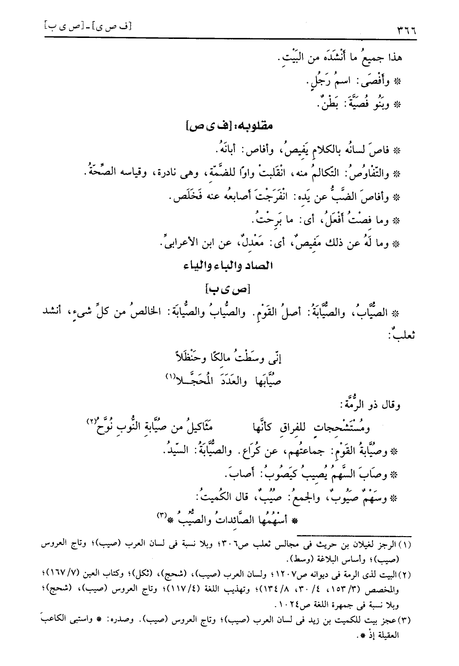 فاصَ لسانُه بالكلامِ يَفِيصُ وأفاص أبانَهُ والتّفْاوُصُ التّكالُم منه انْقَلَبتْ واواً للضَّمةِ وهي نادرة وقياسه الصِّحَةُ وأفاصَ الضَّبُّ عن يَدِه انْفَرَجْتَ أَصابعُه عنه فَخَلَص وما فِصْتُ أَفْعَلُ أي ما بَرِحْتُ وما لَهُ عن ذلك مَفِيصٌ أي مَعْدِلٌ عن ابن الأعرابيِّ