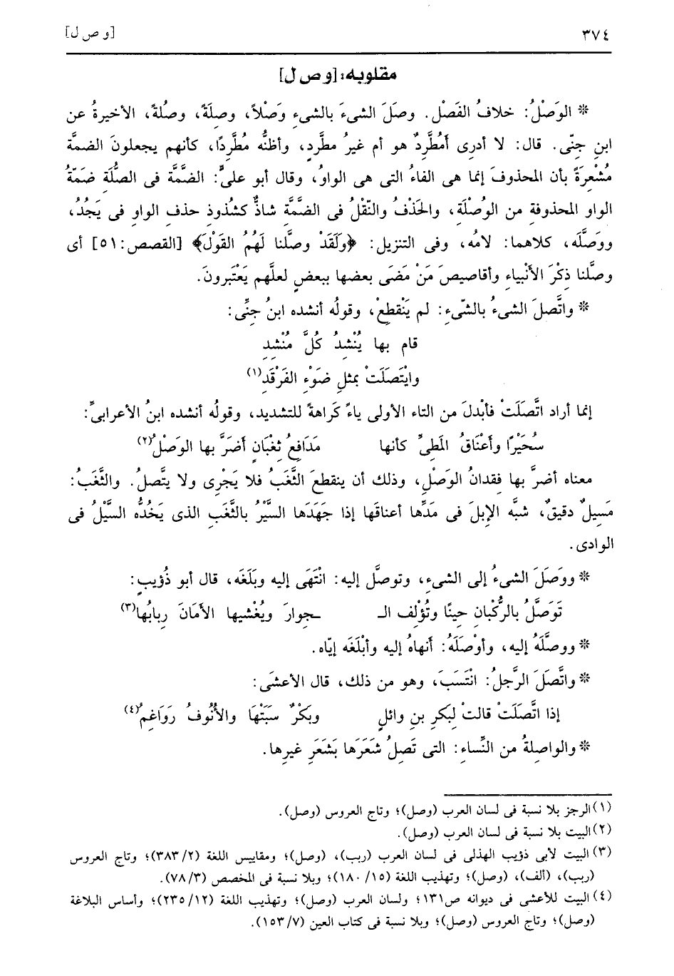 الوَصْلُ خلافُ الفَصْل وصَلَ الشيءَ بالشيءِ وَصْلاً وصِلَةً وصُلةً الأخيرةُ عن ابنِ جِنّي قال لا أدرِي أَمُطَّرِدٌ هو أم غيرُ مطَّردٍ وأظنُّه مُطَّرِداً كأنهم يجعلونَ الضمَّة مُشْعِرَةً بأن المحذوفَ إنما هي الفاءُ التي هي الواوُ وقال أبو عليٍّ الضَّمَّة في الصُّلَة ضَمّةُ الواو المحذوفةِ من الوُصْلَةِ والحَذْفُ والنّقْلُ في الضَّمَّة شاذٌ كشُذوذِ حذفِ الواوِ في يَجُدُ ووَصَّلَه كلاهما لامُه وفي التنزيل {ولقد وصلنا لهم القول} القصص 51 أي وصَّلنا ذِكْرَ الأنْبياءِ وأقاصيصَ مَنْ مَضَي بعضها ببعضٍ لعلَّهم يَعْتَبرونَ واتَّصلَ الشيءُ بالشّيءِ لم يَنْقطِعْ وقولُه أنشده ابنُ جِنِّي