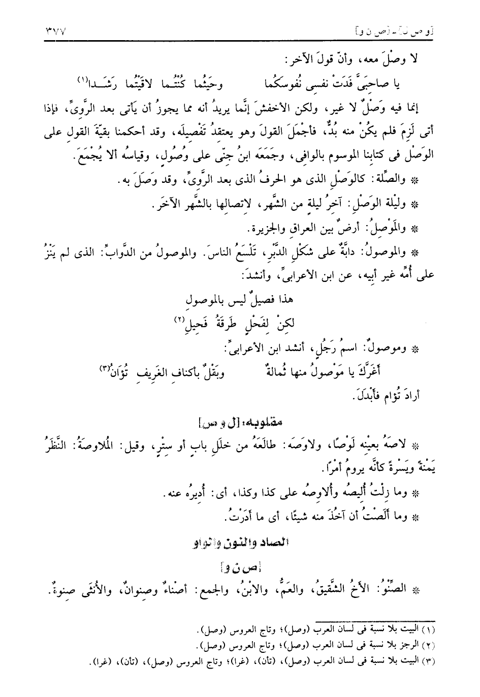 إنما فيه وَصْلٌ لا غير ولكن الأخفشَ إنَّما يريدُ أنه مما يجوزُ أن يَأتي بعد الرَّوِيِّ فإذا أتى لَزِمَ فلم يكُنْ منه بُدٌّ فأجْمَلَ القولَ وهو يعتقِدُ تَفْصِيلَه وقد أحكمنا بقيّةَ القولِ على الوَصْل في كتابِنا الموسوم بالوافِي وجَمَعَه ابنُ جِنّي على وُصُولٍ وقياسُه ألا يُجْمَعَ والصِّلة كالوَصْلِ الذي هو الحرفُ الذي بعد الرَّوِيِّ وقد وَصَلَ به وليْلة الوَصْلِ آخِرُ ليلةٍ من الشَّهر لاتِصالِها بالشَّهر الآخَر والمَوْصِلُ أرضٌ بين العراقِ والجزيرة والموصولُ دابَّةٌ على شَكْلِ الدَّبْرِ تَلْسَعُ الناسَ والموصولُ من الدَّوابِّ الذي لم يَنْزُ على أُمِّه غير أبِيه عن ابن الأعرابيِّ وأنشدَ