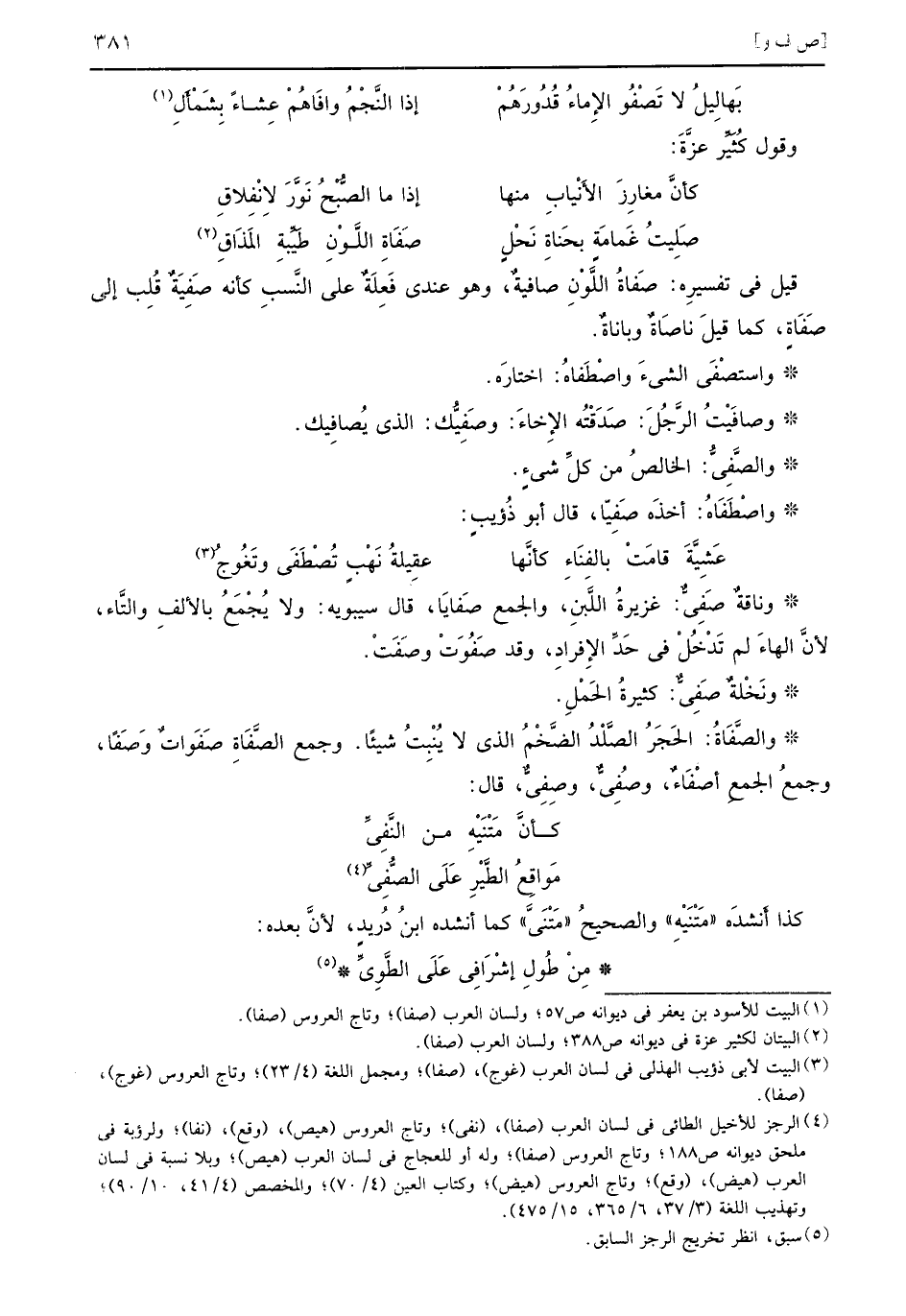 قيل في تفسيرِه صَفاةُ اللَّوْنِ صافيةٌ وهو عندي فَعِلَةٌ على النَّسبِ كأنه صَفِيَةٌ قُلِبَ إلى صَفَاةٍ كما قيلَ ناصَاةٌ وباناةٌ واستصْفَى الشيءَ واصْطَفاهُ اختارَه وصافَيْتُ الرَّجُلَ صَدَقْتُه الإِخاءَ وصَفِيُّك الذي يُصافِيك والصَّفِيُّ الخالصُ من كلِّ شيءٍ واصْطَفَاهُ أخذَه صَفِيّا قال أبو ذُؤيبٍ