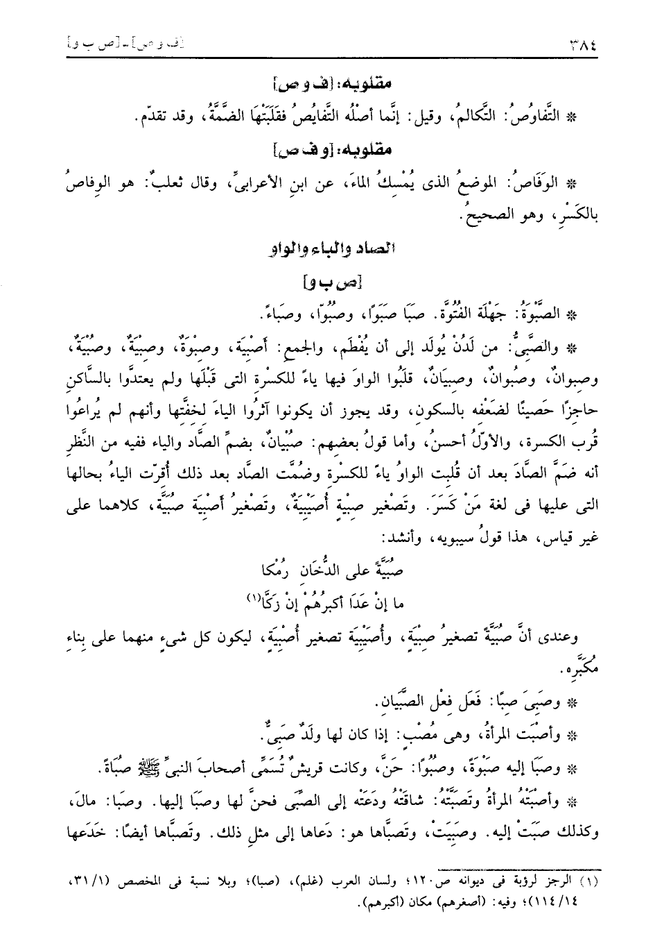 والصَّبْوَةُ جَهْلَة الفُتُوَّة صَبَا صَبَواً وصُبُوّا وصَباءً والصَّبِيُّ من لَدُنْ يُولَد إلى أن يُفْطَم والجمعِ أَصْبِيَة وصِبوَةٌ وصِبْيَةٌ وصُبْيَةٌ وصِبوانٌ وصُبوانٌ وصِبيَانٌ قَلَبُوا الواوَ فيها ياءً للكسْرةِ التي قَبْلَها ولم يعتدَّوا بالسَّاكنِ حاجِزاً حَصيناً لضَعْفِه بالسكونِ وقد يجوز أن يكونوا آثرُوا الياءَ لِخِفَّتِها وأنهم لم يُراعُوا قُرب الكسرة والأوّلُ أحسنُ وأما قولُ بعضِهم صُبْيانٌ بضمِّ الصَّاد والياء ففيه من النَّظرِ أنه ضَمَّ الصَّادَ بعد أن قُلِبت الواوُ ياءً للكسْرةِ وضُمَّت الصَّاد بعد ذلك أُقِرّت الياءُ بحالها التي عليها في لغة مَنْ كَسَرَ وتَصْغير صِبيْةٍ أُصَيْبِيَةٌ وتَصْغيرُ أَصْبِيَة صُبَيَّة كلاهما على غير قياس هذا قولُ سيبويه وأنشد