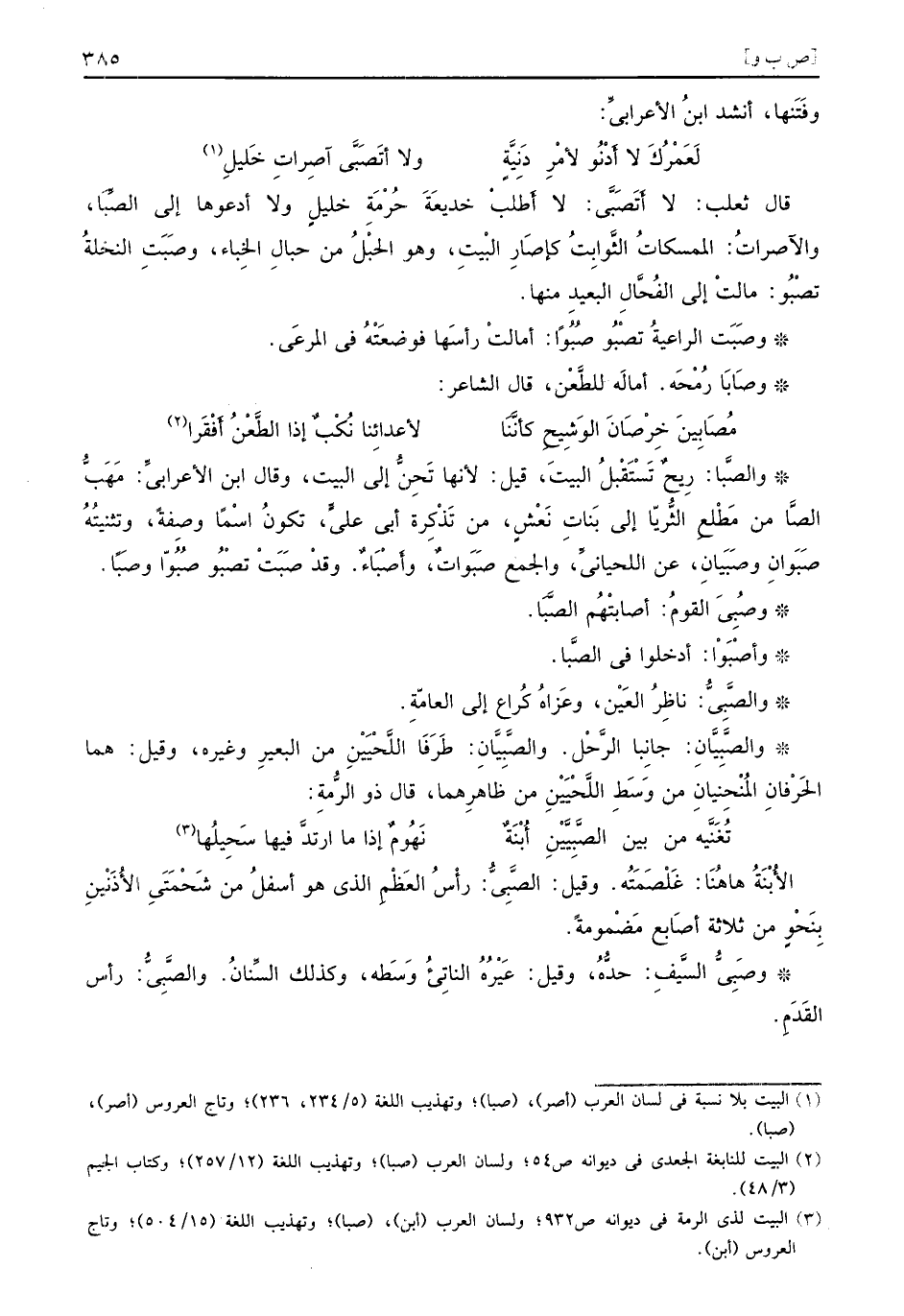 قال ثعلب لا أَتَصَبَّى لا أطلبْ خديعَةَ حُرْمَةِ خليلٍ ولا أدعوها إلى الصِّبَا والآصراتُ الممسكاتُ الثَّوابِتُ كإصَارِ البْيتِ وهو الحبْلُ من حبالِ الخِباء وصَبَتِ النخلةُ تصْبُو مالتْ إلى الفُحَّالِ البعيدِ منها وصَبَت الراعيةُ تصْبُو صُبُواً أمالتْ رأسَها فوضَعْتُه في المرعَى وصَابَا رُمْحَه أمالَه للطَّعْن قال الشاعر