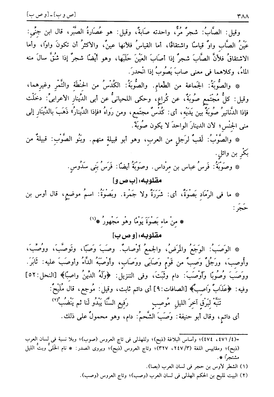 وقيل الصَّابُ شجرٌ مُرٌّ واحدته صَابةٌ وقيل هو عُصَارةُ الصَّبْر قال ابن جِنِّي عَيْنُ الصَّابِ واوٌ قياساً واشتقاقاً أما القياسُ فلأنها عينٌ والأكثرُ أن تكونَ واواً وأما الاشتقاقُ فلأَنَّ الصَّابَ شجرٌ إذا أصَابَ العَيْنَ حَلَبَها وهو أَيْضاً شجرٌ إذا شُقَّ سالَ منه الماءُ وكلاهما في معنى صابَ يَصُوبُ إذا انْحدرَ والصُّوبَةُ الجَماعة من الطّعامِ والصُّوبَةُ الكُدْسُ من الحِنْطَةِ والتَّمْرِ وغيرِهما وقيل كلُّ مُجْتَمِعٍ صُوبَةٌ عن كُراعٍ وحكى اللحيانيُّ عن أبي الدِّينارِ الأعرابيِّ دخَلْت فإذا الدَّنانيرُ صُوبَةٌ بين يَدَيْهِ أي كُدْسٌ مجتَمِع ومن رَواهُ فإذا الدِّينارُ ذَهَبَ بالدِّينَارِ إلى مني الجِنْسِ لأن الدينارَ الواحدَ لا يكون صُوبَةً والصَّوْبُ لَقبٌ لرَجُلٍ من العربِ وهو أبو قبيلةٍ منهم وبَنُو الصَّوْبِ قبيلةٌ من بَكْرِ بن وائلٍ وصَوْبَةُ فَرسُ عباس بن مِرْداس وصَوْبَةُ أيضاً فَرَسُ بَنِي سَدُوسٍ