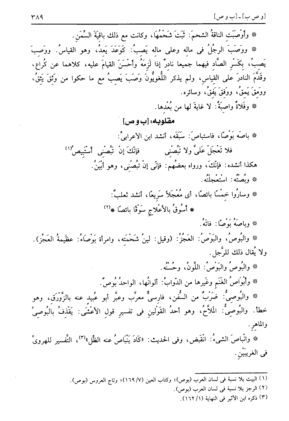 وباصَهُ بَوْصاً فاتَهُ والبُوصُ والبَوْصُ العَجُزُ وقيل لينُ شَحْمَتِه وامرأة بَوْصَاءُ عَظيمةُ العَجُز ولا يُقال ذلك للرَّجل والبُوصُ والبَوْصُ اللَّونُ وحُسْنُه وأَبْوَاصُ الغَنَمِ وغَيرها من الدّوابِّ ألوانُها الواحدُ بُوصٌ والبُوصِيُّ ضَرْبٌ من السُّفن فارِسيٌّ معرَّب وعبَّر أبو عُبيدٍ عنه بالزَّوْرَقِ وهو خطأ والبُوصِيُّ المَلاَّحُ وهو أحدُ القَوْلَينِ في تفسيرِ قولِ الأَعْشَى يَقْذِفُ بالبُوصِيِّ والماهِرِ وانْباصَ الشيءُ انْقَبض وفي الحديث كَادَ يَنْبَاصُ عنه الظِّل التَّفسير للهرويِّ في الغريبَيْنِ