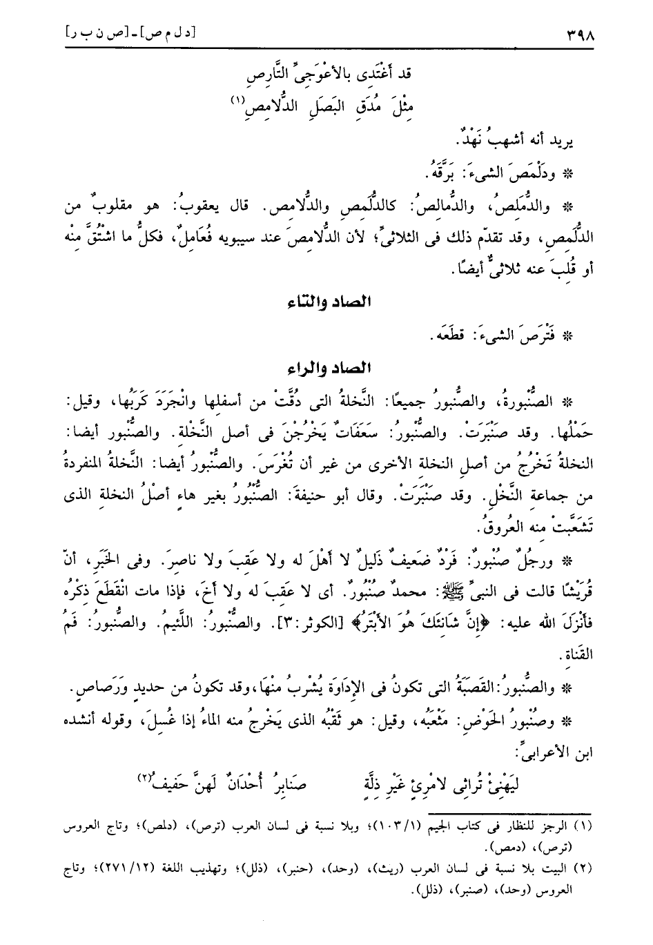 الصُّنْبورةُ والصُّنبورُ جميعاً النَّخلةُ التي دُقَّتْ من أسفلِها وانْجَرَدَ كَرَبُها وقيل حَمْلُها وقد صَنْبَرَتْ والصُّنْبورُ سَعَفَاتٌ يَخْرُجْنَ في أصل النَّخْلةِ والصُّنبور أيضاً النخلةُ تَخْرُجُ من أصلِ النخلةِ الأخرى من غير أن تُغْرَسَ والصُّنْبورُ أيضا النَّخلةُ المنفردةُ من جماعةِ النَّخْلِ وقد صَنْبَرَتْ وقال أبو حنيفةَ الصُّنْبُورُ بغير هاءٍ أصْلُ النخلةِ الذي تَشَعَّبتْ مِنه العُروقُ ورجُلٌ صُنْبورٌ فَرْدٌ ضَعيفٌ ذَليلٌ لا أَهْلَ له ولا عَقِبَ ولا ناصِرَ وفي الخَبَرِ أنّ قُرَيْشاً قالت في النبيِّ صلى الله عليه وسلم محمدٌ صُنْبُورٌ أي لا عَقِبَ له ولا أَخَ فإذا مات انْقَطَعَ ذِكْرُه فأَنْزَلَ الله عليه {إن شانئك هو الأبتر} الكوثر 3 والصُّنْبورُ اللَّئيمُ والصُّنبورُ فَمُ القَناةِ والصُّنبورُ القَصَبَةُ التي تكونُ في الإِدَاوَة يُشْربُ منْهَا وقد تكونُ من حديدٍ وَرَصاصٍ وصُنْبورُ الحَوْضِ مَثْعَبُه وقيل هو ثَقْبُه الذي يَخْرجُ منه الماءُ إذا غُسِلَ وقوله أنشده ابن الأعرابيِّ