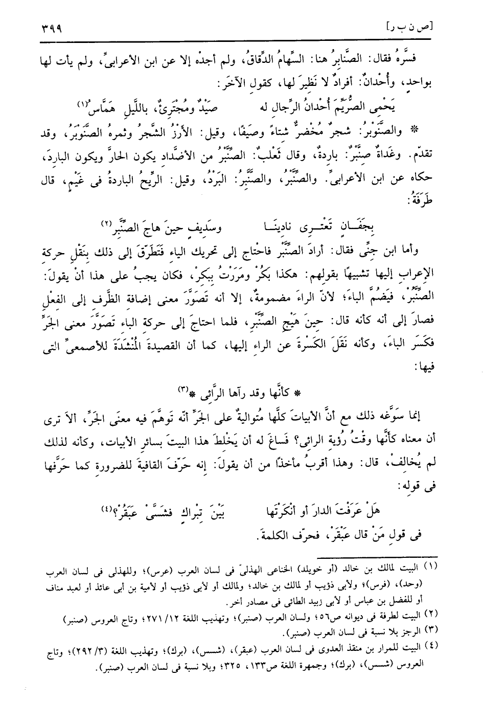 وأما ابن جِنِّي فقال أرادَ الصِّنَّبْر فاحْتاج إلى تحريك الياءِ فَتَطَرّقَ إلى ذلك بِنَقْلِ حركةِ الإِعرابِ إليها تشبيهاً بقولِهم هكذا بَكُرْ ومَرَرْتُ بِبَكْرِ فكان يجبُ على هذا أنْ يقولَ الصِّنَّبُرْ فيَضُمَّ الباءَ لأنّ الراءَ مضمومةٌ إلا أنه تَصَوَّرَ معنى إضافةِ الظَّرفِ إلى الفِعْلِ فصارَ إلى أنه كأنه قال حِينَ هَيْجِ الصِّنَّبْرِ فلما احتاجَ إلى حركةِ الباءِ تَصَوَّرَ معنى الجَرِّ فكَسَر الباءَ وكأنه نَقَلَ الكَسْرةَ عن الراءِ إليها كما أن القصيدةَ المُنْشَدَةَ للأصمعيِّ التي فيها