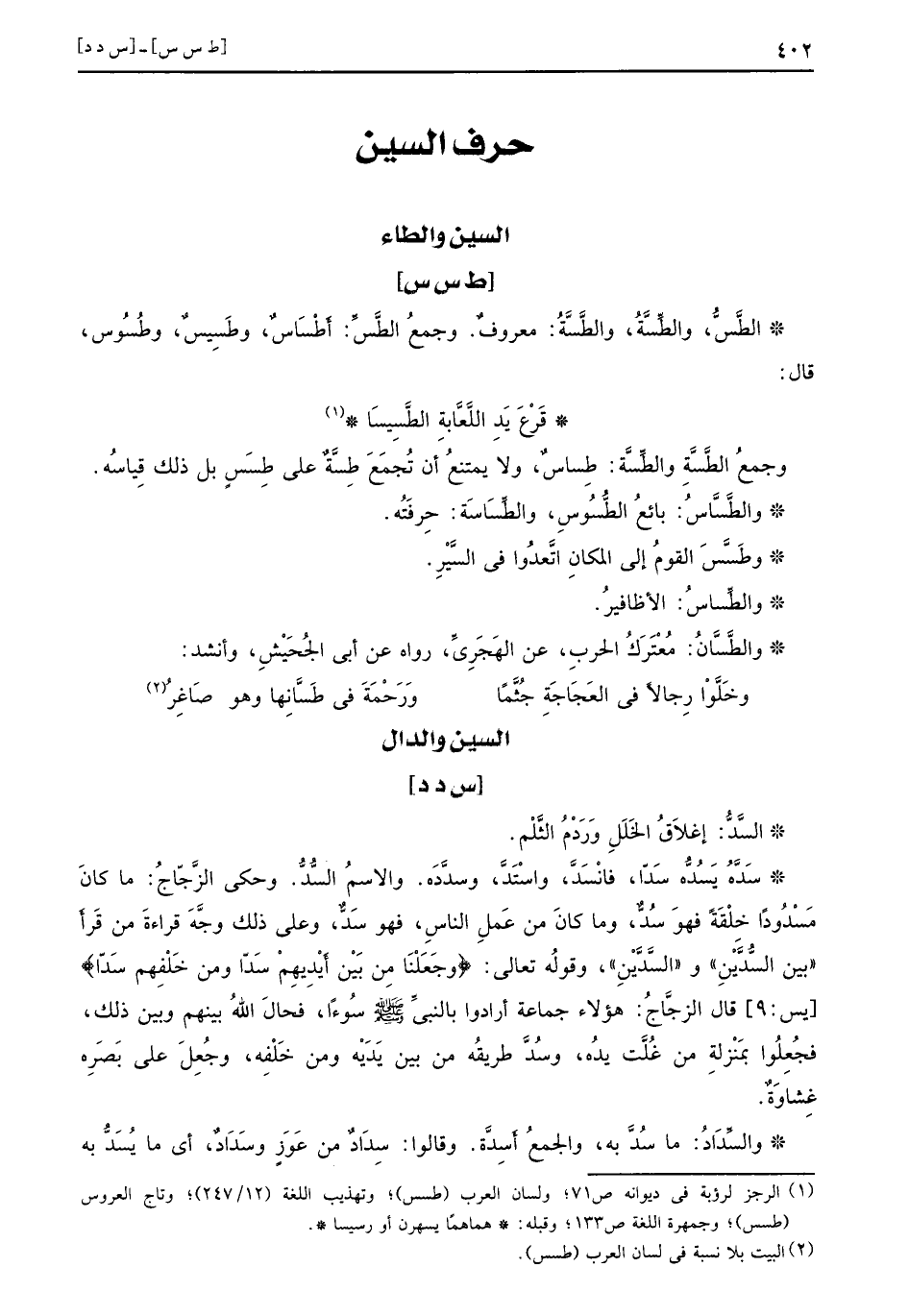 وجمعُ الطَّسَّةِ والطِّسَّةِ طِساسٌ ولا يمتنعُ أن تُجمَعَ طِسَّةٌ على طِسَسٍ بل ذلك قِياسُه والطَّسَّاسُ بائعُ الطُّسُوسِ والطِّسَاسَة حِرْفَتُه وطَسَّسَ القومُ إلى المكانِ اتَّعدُوا في السَّيْرِ والطِّساسُ الأظافيرُ والطَّسَّانُ مُعْتَرَكُ الحربِ عن الهَجَرِيِّ رواه عن أبي الجُحَيْشِ وأنشد