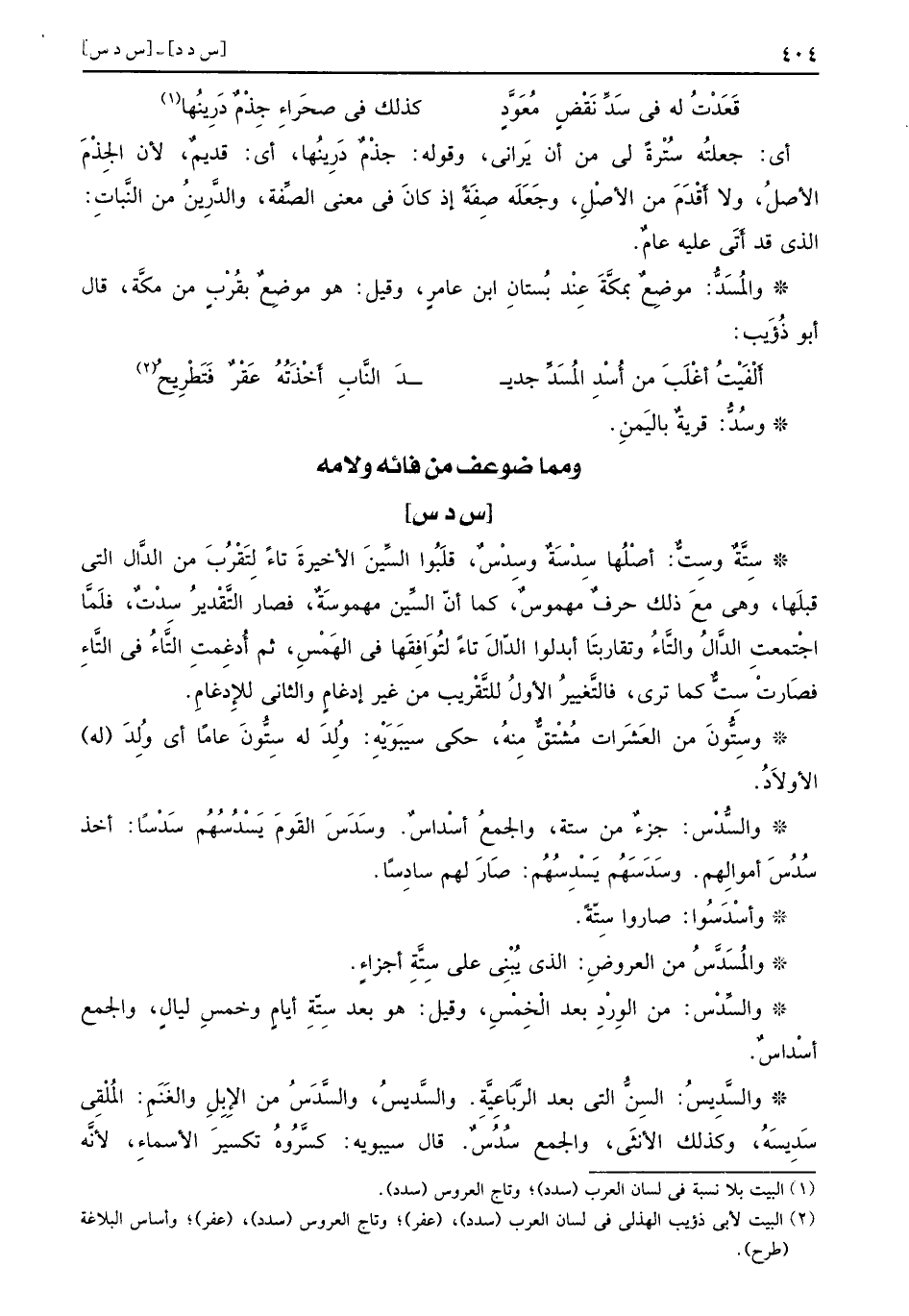 سِتَّةٌ وسِتٌّ أصْلُها سِدْسَةٌ وسِدْسٌ قلَبُوا السِّينَ الأخيرةَ تاءً لِتَقْرُبَ من الدَّال التي قبلَها وهي مع ذلك حرفٌ مهموسٌ كما أنّ السِّين مهموسَةٌ فصار التَّقْديرُ سِدْتٌ فلَمَّا اجْتمعتِ الدَّالُ والتَّاءُ وتقاربتَا أبدلوا الدّالَ تاءً لتُوَافِقَهما في الهَمْسِ ثم أُدغِمتِ التَّاءُ في التَّاءِ فصَارتْ سِتٌّ كما ترى فالتَّغييرُ الأولُ للتَّقْريب من غير إدغامٍ والثاني للإِدغامِ وسِتُّونَ من العَشَرات مُشْتقٌّ مِنهُ حكى سيبَوَيْهِ وُلِدَ له سِتُّونَ عاماً أي وُلِدَ له الأولاَدُ والسُّدْس جزءٌ من ستة والجمعُ أسْداسٌ وسَدَسَ القَومَ يَسْدُسُهُم سَدْساً أخذ سُدُسَ أموالِهم وسَدَسَهُم يَسْدِسُهُم صَارَ لهم سادِساً وأسْدَسُوا صاروا سِتّةً والمُسَدَّسُ من العروضِ الذي يُبْنِي على سِتَّةِ أجزاءٍ والسِّدْس من الوِرْدِ بعد الخِمْسِ وقيل هو بعد سِتّةِ أيامٍ وخمسِ ليالٍ والجمع أسْداسٌ والسَّدِيسُ السِنُّ التي بعد الرَّبَاعيةِ والسَّديسُ والسَّدَسُ من الإِبِلِ والغَنَمِ المُلْقِي سَدِيسَهُ وكذلك الأنثَى والجمع سُدُسٌ قال سيبويه كسَّرُوهُ تكسيرَ الأسماءِ لأنَّه