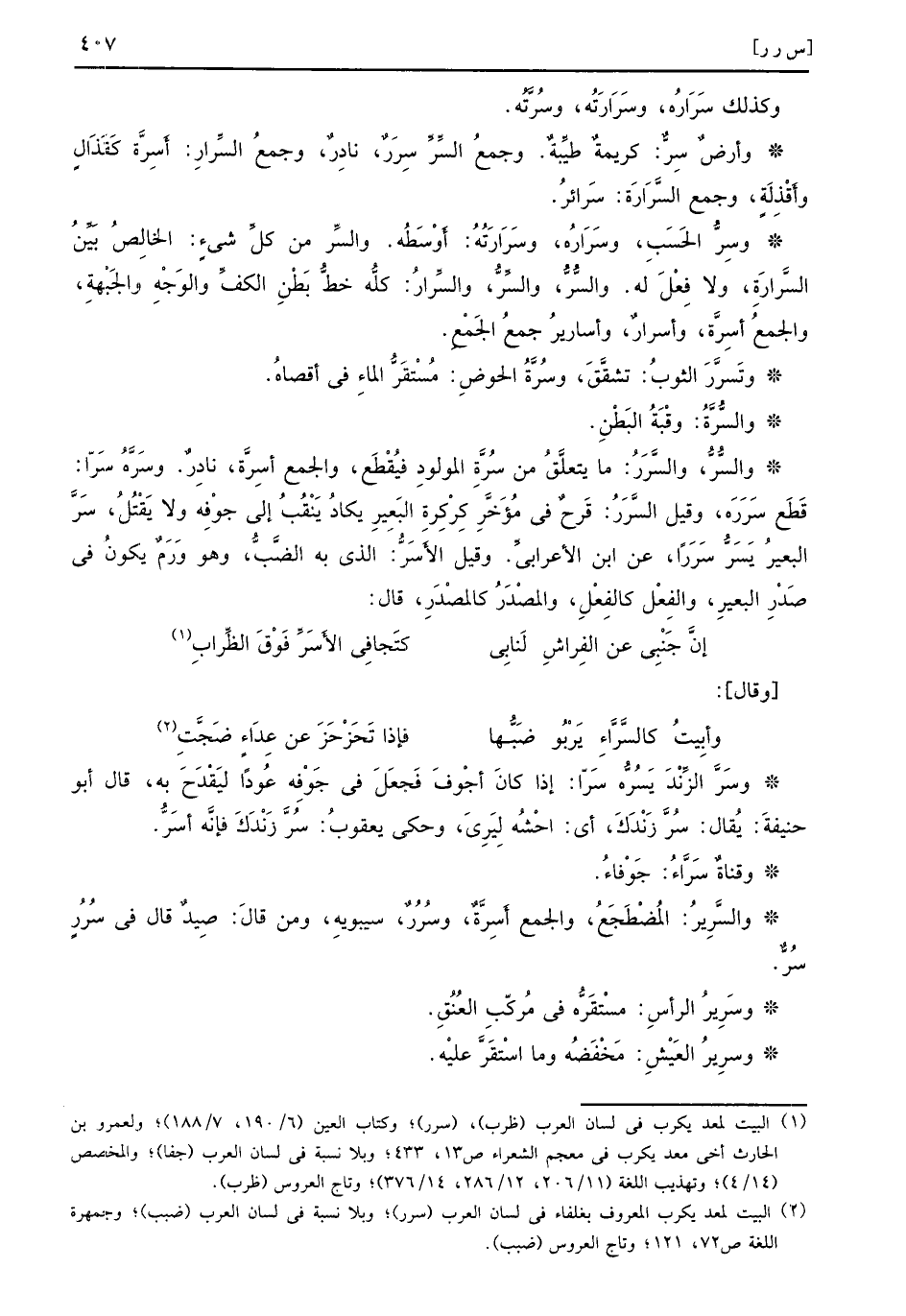 وكذلك سَرارُه وسَرَارَتُه وسُرَّتُه وأرضٌ سِرٌّ كريمةٌ طيِّبةٌ وجمعُ السِّرِّ سِرَرٌ نادِرٌ وجمعُ السِّرارِ أَسِرَّة كَقَذَالٍ وأَقْذِلَةٍ وجمع السَّرَارَة سَرائرُ وسِرُّ الحَسَبِ وسَرَارُه وسَرَارَتُهُ أَوْسَطُه والسِّر من كلِّ شيءٍ الخالِصُ بَيِّنُ السَّرارَةِ ولا فِعْلَ له والسُّرُّ والسِّرُّ والسِّرارُ كلُّه خطُّ بَطْنِ الكفِّ والوَجْهِ والجَبْهةِ والجمعُ أسِرَّة وأسرارٌ وأساريرُ جمعُ الجَمْعِ وتَسرَّرَ الثوبُ تشقَّقَ وسُرَّةُ الحوضِ مُسْتقَرُّ الماءِ في أقصاهُ والسُّرَّةُ وقْبَةُ البَطْنِ والسُّرُّ والسَّرَرُ ما يتعلَّقُ من سُرَّةِ المولودِ فيُقْطَع والجمع أسِرَّة نادِرٌ وسَرَّهُ سَرّا قَطَع سَرَرَه وقيل السَّرَرُ قَرحٌ في مُؤَخَّرِ كِرْكِرِةِ البَعِيرِ يكادُ يَنْقُبُ إلى جوفِه ولا يَقْتُلُ سَرَّ البعيرُ يَسَرُّ سَرَراً عن ابن الأعرابيِّ وقيل الأَسَرُّ الذي به الضَّبُّ وهو وَرَمٌ يكونُ في صَدْرِ البعيرِ والفِعْل كالفِعْلِ والمصْدَرُ كالمصْدَرِ قال