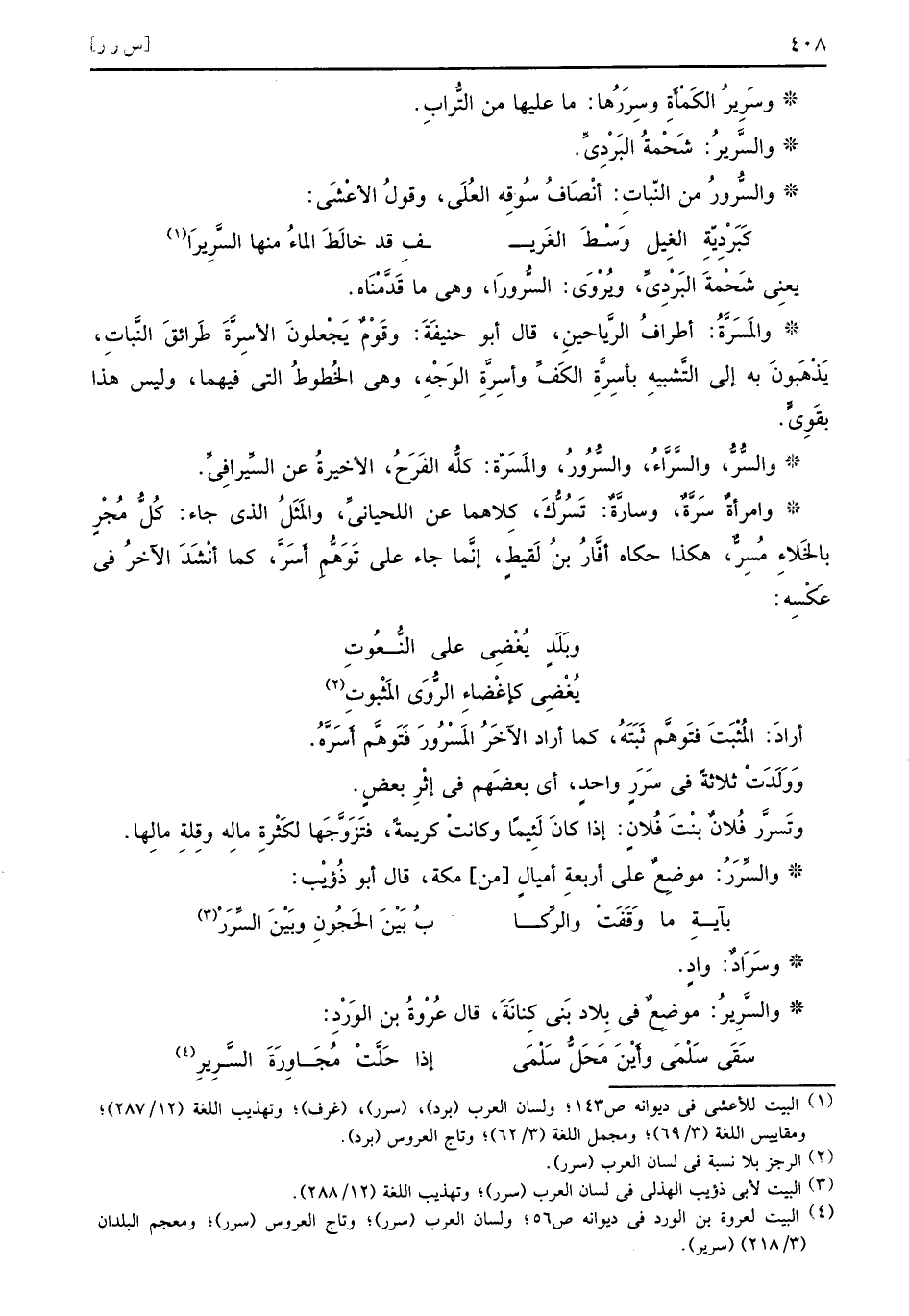 يعنِي شَحْمةَ البَرْدِيِّ ويُرْوَى السُّرورَا وهي ما قَدَّمْنَاه والمَسَرَّةُ أطرافُ الرَّياحينِ قال أبو حنيفَةَ وقَوْمٌ يَجْعلونَ الأسِرَّةَ طَرائقَ النَّباتِ يَذْهَبونَ به إلى التَّشبيهِ بأسِرَّةِ الكَفِّ وأسِرَّةِ الوَجْهِ وهي الخُطُوطُ التي فيهما وليس هذا بقَوِيٍّ والسُّرُّ والسَّرَّاءُ والسُّرُورُ والمَسَرّة كلُّه الفَرَحُ الأخيرةُ عن السِّيرافِيِّ وامرأةٌ سَرَّةٌ وسارَّةٌ تَسُرَّكَ كِلاهما عن اللحيانيِّ والمَثَلُ الذي جاءَ كُلُّ مُجْرٍ بالخَلاءِ مُسِرٌّ هكذا حكاه أفَّارُ بنُ لَقيطٍ إنَّما جاء على تَوَهُّمِ أَسَرَّ كما أنْشَدَ الآخرُ في عَكْسِه