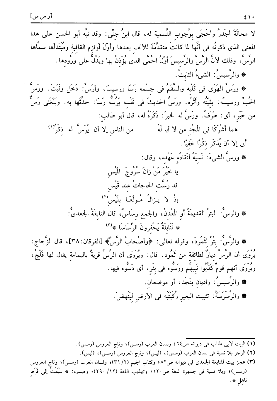 والرَّسُّ بِئْرٌ لِثَمُودَ وقوله تعالى {وأصحاب الرس} الفرقان 38 قال الزَّجّاجُ يُرْوَى أن الرَّسَّ دِيارٌ لطائِفَةٍ من ثَمُود قال ويُرْوَى أن الرَّسَّ قريةٌ باليمامةِ يقال لها فَلْجُ ويُرْوَى أنهم قومٌ كَذَّبُوا نَبِيَّهم ورَسُّوه في بِئْرٍ أي دَسُّوه فيها والرَّسيسُ واديانِ بنَجْد أو موضعانِ والرَّسْرَسَةُ تثبيت البعيرِ رُكْبَتَيْه في الأرضِ لِيَنْهضَ