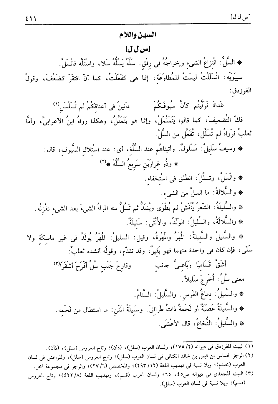السَّلُّ انْتِزاعُ الشيءِ وإخراجُهُ في رِفْقٍ سَلَّهُ يَسُلُّهُ سَلا واسْتَلَّه فانْسَلَّ سيبَوَيْه انْسَلَلْتُ ليسَتْ للمُطاوَعَةِ إنما هي كفَعَلْتُ كما أنّ افتقَرَ كضَعُفَ وقولُ الفرزدقِ