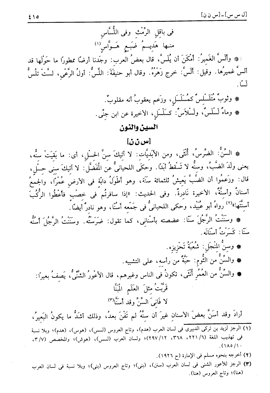 السِّنُّ الضِّرسُ أنْثَى ومن الأَبَدِيَّاتِ لا آتِيكَ سِنَّ الحِسْلِ أي ما بَقَيِتْ سِنُّه يعني ولَدَ الضَّبِّ وسِنُّه لا تَسْقطُ أبَداً وحكَى اللحيانيُّ عن المُفَضَّل لا آتِيكَ سِنِي حِسْلٍ قال وزَعمُوا أن الضَّبَّ يَعِيشُ ثلثمائة سَنَة وهو أَطْوَلُ دابّةٍ في الأرضِ عُمْراً والجمعُ أسنانٌ وأسِنَّةٌ الأخيرة نَادِرةٌ وفي الحديث إذا سافرتُم في خِصْبٍ فأَعْطُوا الرُّكُبَ أسِنَّتَها رواهُ أبو عُبَيْد وحكى اللحيانيُّ في جَمْعِه أَسْنّا وهو نادِرٌ أيضاً وسَنَنْتُ الرَّجُلَ سَناً عضصته بأسْنانِي كما تقول ضَرَسْتُه وسَنَنْتُ الرَّجُلَ أَسُنُّه سَناً كَسَرْتُ أسْنَانَه وسِنُّ المِنْجَلِ شُعْبَةُ تَحْزِيزِه والسِّنُّ من الثُّومِ حَبَّةٌ من رأسِهِ على التشبيه والسِّنُّ من العُمُرِ أُنْثَى تكونُ في الناس وغيرهم قال الأَعْورُ الشَّنِّيُّ يَصِفُ بعيراً