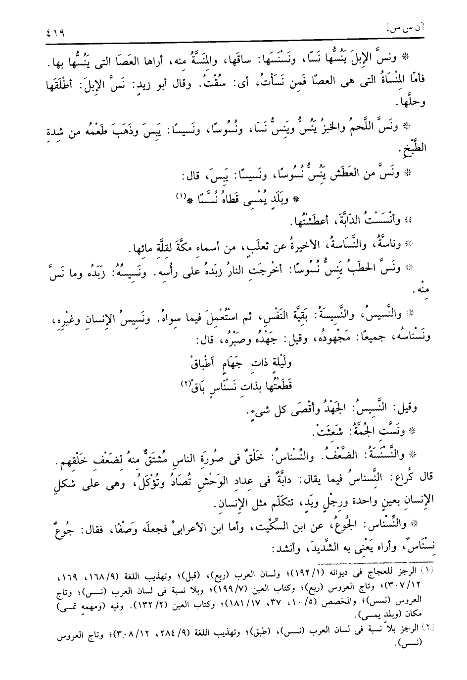 وأنْسَسْتُ الدّابَّةَ أعطَشْتُها وناسَّةُ والنَّسَاسةُ الأخيرةُ عن ثعلَبٍ من أسماءِ مكَّةَ لِقلَّةِ مائِها ونَسَّ الحطَبُ يَنِسُّ نُسُوساً أخْرجَتِ النارُ زبَدهُ على رأْسِه ونَسِيسُهُ زَبَدَهُ وما نَسَّ مِنْه والنَّسيسُ والنَّسِيسَةُ بَقِيَّة النَفْسِ ثم اسْتُعْمِلَ فيما سِواهُ ونَسِيسُ الإِنسانِ وغيْرِهِ ونَسْناسُه جميعاً مَجْهودُه وقيل جَهْدُه وصَبْرُه قال