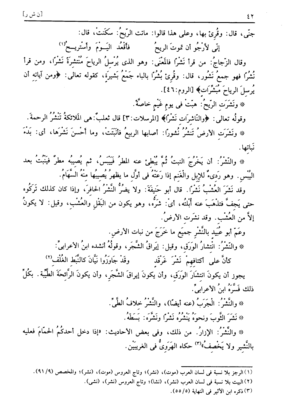 وقال الزّجاجُ من قرأ نَشْراً فالمَعْنَى وهو الذي يُرْسِلُ الرياحَ مُنْتِشرَةً نَشْراً ومن قرأ نُشُراً فهو جمع نَشُور قال وقُرِئ بُشُراً بالباء جَمْعُ بَشيرَةٍ كقوله تعالى {ومن آياته أن يرسل الرياح مبشرات} الروم 46 ونَشَرَتِ الرّيحُ هبّتْ في يومِ غَيْمٍ خاصَّةٌ وقولُه تعالى {والناشرات نشرا} المرسلات 3 قال ثعلبٌ هي المَلائكةُ تَنْشُرُ الرحمةَ ونَشَرَتِ الأرضُ تَنشُرُ نُشوراً أصابها الربيعُ فأنَبَتَتْ وما أَحْسنَ نَشْرَها أي بَدْءَ نَباتِها والنّشْرُ أن يَخْرُجَ النبتُ ثُمَّ يُبْطِئ عنه المطرُ فَيَيْبَسُ ثم يُصِيبُه مطرٌ فَيْنُبتُ بعد اليُبْسِ وهو رَدِيءٌ للإِبِل والْغَنِم إذا رَعَتْهُ في أوَّلِ ما يظهرُ يُصيِبُها مِنْهُ السَّهَامُ وقد نَشَرَ العُشْبُ نَشْراً قال أبو حَنِيفَةَ ولا يضُرُّ النَّشْرُ الحافِرَ وإذا كان كذلك تَرَكُوه حتى يَجِفَّ فتذْهَبَ عنه أُبْلتُه أيْ شَرُّه وهو يكون من البَقْلِ والعُشْبِ وقيل لا يكونُ إلاَّ من العُشْبِ وقد نشَرتِ الأرضُ وعَمّ أبو عُبَيدٍ بالنَّشْرِ جميَع ما خَرَجَ من نبات الأرضِ والنّشْرُ انْتِشارُ الوَرَقِ وقيل إيَراقُ الشَّجَر وقولُهُ أنشده ابنُ الأعرابيِّ