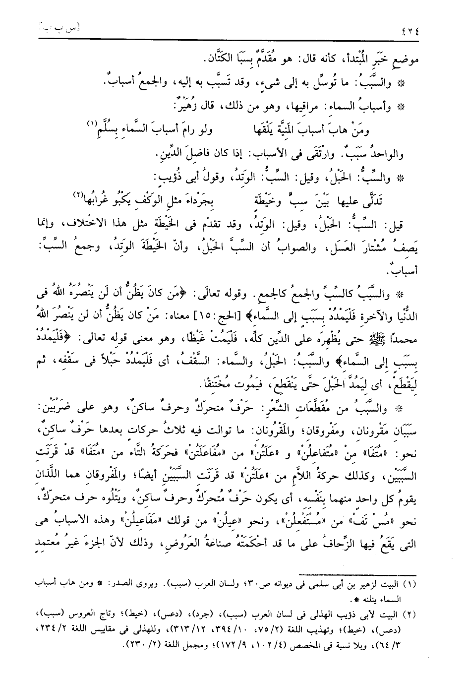 قيل السِّبُّ الحَبْلُ وقيل الوَتِدُ وقد تقدّم في الخَيْطَةِ مثل هذا الاختلاف وإنما يَصِفُ مُشْتارَ العَسَل والصوابُ أن السِّبَّ الحَبْلُ وأنّ الخَيْطَةَ الوَتِدُ وجمعُ السِّبِّ أسبابٌ والسَّبَبُ كالسِّبِّ والجمعُ كالجمعِ وقوله تعالَى {من كان يظن أن لن ينصره الله في الدنيا والآخرة فليمدد بسبب إلى السماء} الحج 15 معناه مَنْ كان يَظُنُّ أن لن يَنْصُرَ اللهُ محمداً صلى الله عليه وسلم حتى يُظْهِرَه على الدِّين كلِّه فَلْيَمُتْ غَيْظاً وهو معنى قولِه تعالى {فليمدد بسبب إلى السماء} والسَّبَبُ الحَبْلُ والسَّماء السَّقْفُ أي فَلْيَمْدُدْ حَبْلاً في سَقْفِه ثم لِيَقْطَعْ أي لِيَمُدَّ الحَبْلَ حتَّى يَنْقَطِعَ فيَمُوت مُخْتَنِقاً والسَّبَبُ من مُقَطَّعَاتِ الشِّعْرِ حَرْفٌ متحرّكٌ وحرفٌ ساكنٌ وهو على ضَرْبَين سَبَبَانِ مَقْرونانِ ومَفْروقانِ والمَقْرُونانِ ما توالت فيه ثلاثُ حركاتٍ بعدها حَرْفٌ ساكِنٌ نحو مُتَفَا مِنْ مُتَفاعِلُنْ وعَلَتُنْ من مُفَاعَلَتُنْ فحَرَكةُ التَّاء من مُتَفَا قدْ قَرَنَتِ السَّبَبَيْن وكذلك حركةُ اللاَّمِ من عَلَتُن قد قَرَنَتِ السَّبَبَيْنِ أيضاَ والمَفْروقانِ هما اللَّذانِ يقومُ كل واحدٍ منهما بِنَفْسِهِ أي يكون حَرْفٌ مُتحرّكٌ وحرفٌ ساكِنٌ ويَتْلُوه حرف متحركٌ نحو مُسْ تَفْ من مُسْتَفْعِلُنْ ونحو عِيلُنْ من قولك مَفَاعِيلُنْ وهذه الأسبابُ هي التي يَقَعُ فيها الزّحافُ على ما قد أحْكَمَتْهُ صناعةُ العَرُوضِ وذلك لأن الجزءَ غيرُ مُعتِمِدٍ