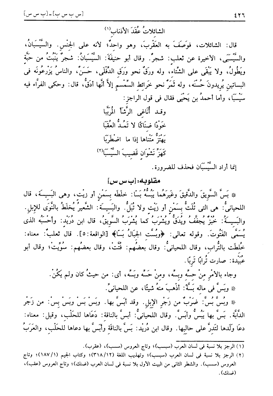 قال الشائلات فوَصَفَ به العَقْربَ وهو واحِدٌ لأنه على الجِنْسِ والسَّيْسَبانُ والسَّيْسَبَي الأخيرة عن ثعلبٍ شجرٌ وقال أبو حنيفَةَ السَّيْسَبانُ شجرٌ يَنْبُتُ من حَبَّةٍ ويَطُولُ ولا يَبْقَى على الشِّتاءِ وله ورَقٌ نحو وَرَقِ الدِّفْلَى حَسَنٌ والناسُ يَزْرعُونَه في البساتينِ يُرِيدونَ حُسْنَه وله ثَمَرٌ نحو خَرائِطِ السِّمْسمِ إلاَّ أنَّها أدَقُّ قال وحكى الفرَّاء فيه سَبْسَبا وأما أحمدُ بن يَحْيَى فقال في قول الراجزِ