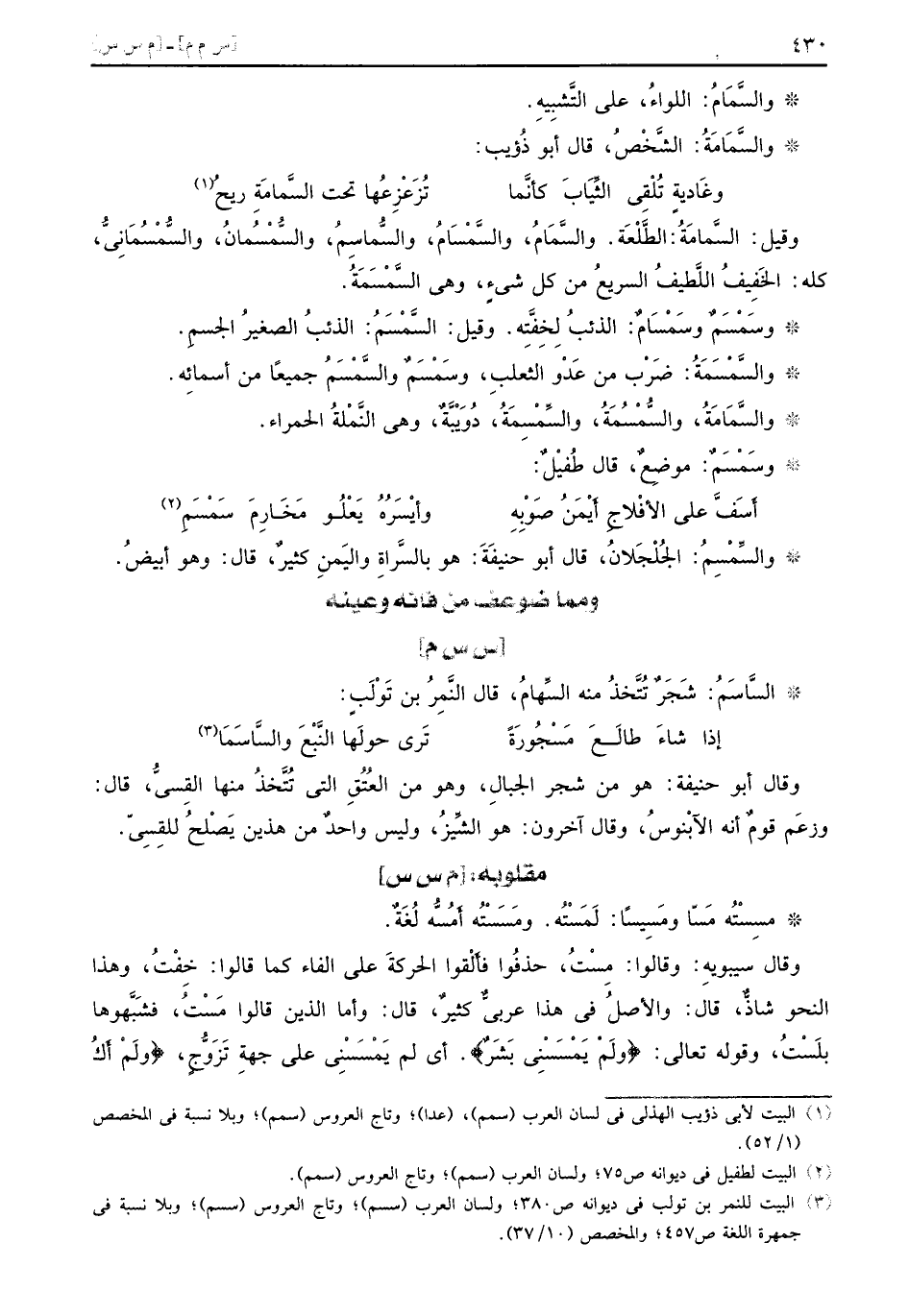 وقيل السَّمامَةُ الطَّلْعَة والسَّمَامُ والسَّمْسَامُ والسُّماسِمُ والسُّمْسُمانُ والسُّمْسُمَانِيُّ كله الخَفِيفُ اللَّطيفُ السريعُ من كل شيءٍ وهي السَّمْسَمَةُ وسَمْسَمٌ وسَمَسَامُ الذئبُ لِخِفَّتِه وقيل السَّمْسَمُ الذئبُ الصغيرُ الجسمِ والسَّمْسَمَةُ ضَرْب من عَدْو الثعلبِ وسَمْسَمٌ والسَّمْسَمُ جميعاً من أسمائِه والسَّمَامَةُ والسُّمْسُمَةُ والسِّمْسِمَةُ دُوَيْبَّةٌ وهي النَّمْلةُ الحمراء وسَمْسَمٌ موضِعٌ قال طُفْيلٌ