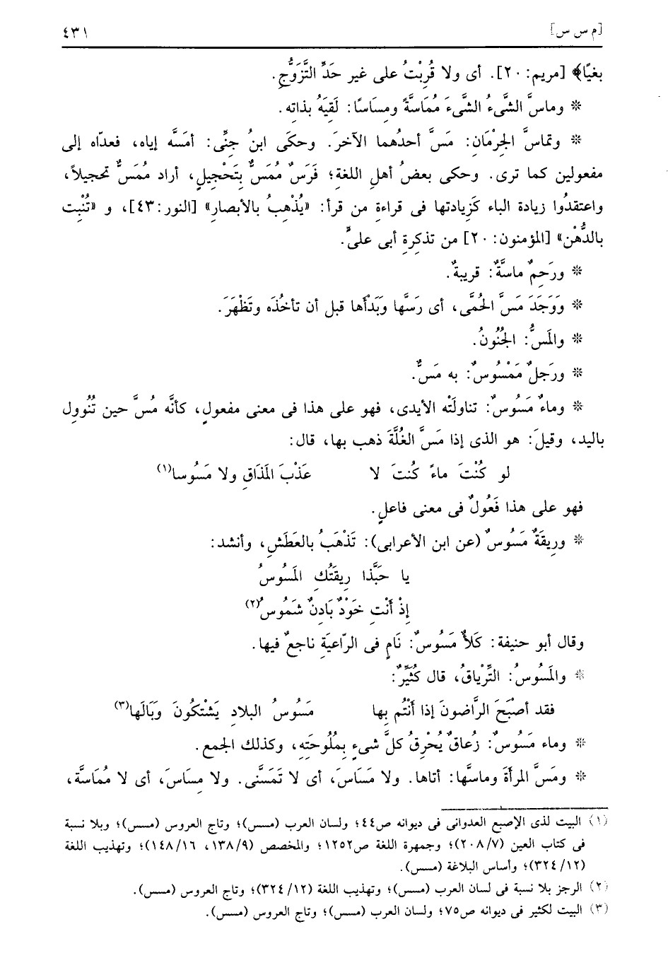 بغياً} مريم 20 أي ولا قُرِبْتُ على غير حَدِّ التَّزَوُّجِ وماسَّ الشَّيءُ الشَّيءَ مُمَاسَّةً ومِسَاساً لَقِيَهُ بذاتِه وتماسَّ الجِرْمَانِ مَسَّ أحدُهما الآخرَ وحكَى ابنُ جِنِّي أمَسَّه إياه فعدّاه إلى مفعولين كما ترى وحكى بعضُ أهلِ اللغةِ فَرَسٌ مُمَسٌ بِتَحْجِيلٍ أراد مُمَسٌّ تحجيلاً واعتقدُوا زيادة الباء كَزِيادتها في قراءةِ من قرأ يُذْهِبُ بالأبصارِ النور 43 وتُنْبِت بالدُّهْن المؤمنون 20 من تذكِرِة أبي عليٍّ ورَحِمٌ ماسَّةٌ قريبةٌ وَوَجَدَ مَسَّ الحُمَّى أي رَسَّها وَبَدْأَها قبل أن تأخُذَه وتَظْهَرَ والمَسُّ الجُنُونُ ورَجلٌ مَمْسُوسٌ به مَسٌّ وماءٌ مَسُوسٌ تناولَتْه الأيدي فهو على هذا في معنى مفعولٍ كأنَّه مُسَّ حين تُنُووِل باليد وقيلَ هو الذي إذا مَسَّ الغُلَّةَ ذهب بها قال