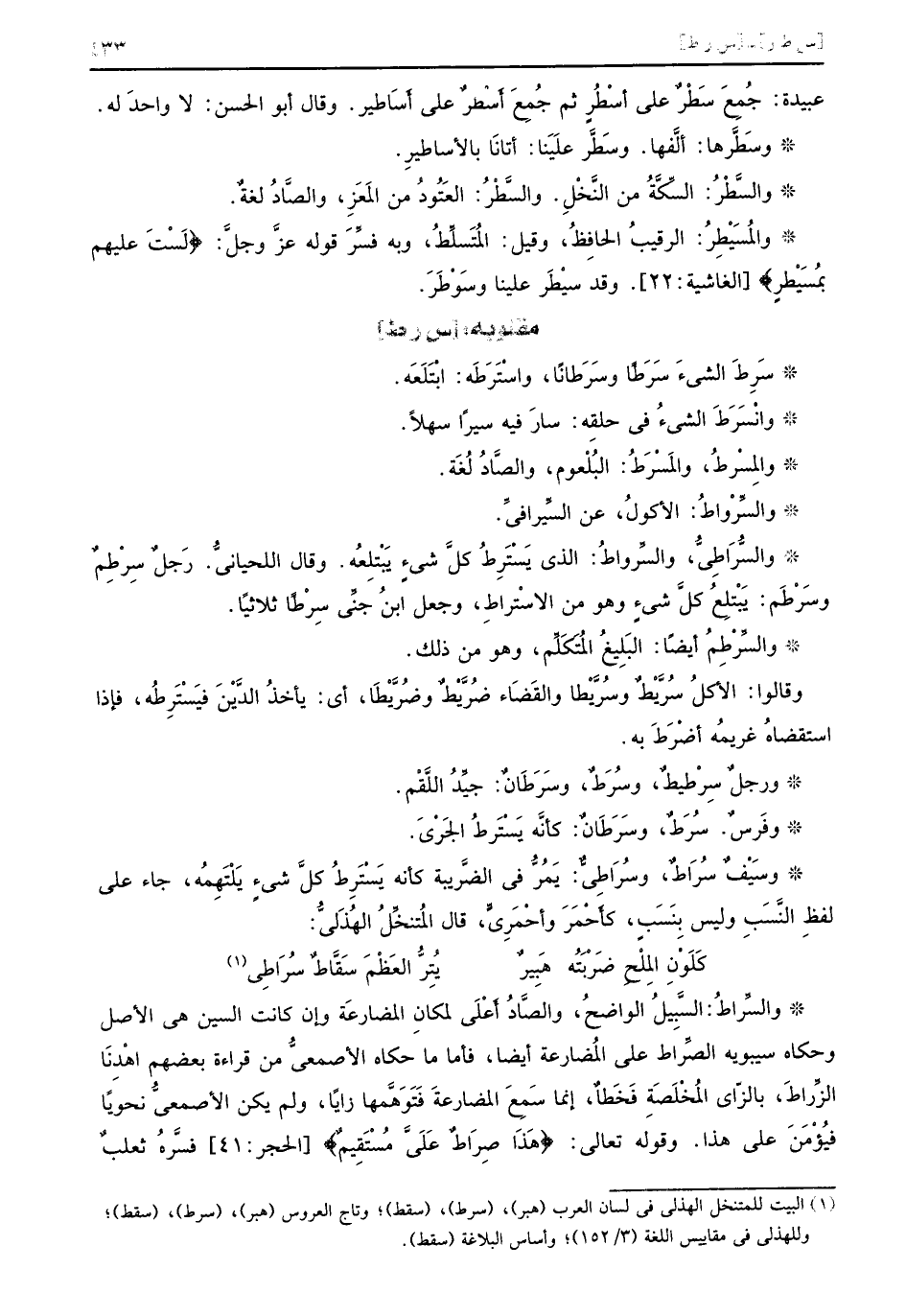 عبيدة جُمِعَ سَطْرٌ على أسْطُرٍ ثم جُمِعَ أَسْطرٌ على أَسَاطير وقال أبو الحسن لا واحدَ له وسَطَّرها ألفَّها وسَطَّر علَيَنا أتانَا بالأساطيرِ والسَّطْرُ السِّكَّةُ من النَّخْلِ والسَّطْرُ العَتُودُ من المَعَزِ والصَّادُ لغةٌ والمُسَيْطِرُ الرقيبُ الحافِظُ وقيل المُتَسلِّطُ وبه فسِّرَ قوله عزَّ وجلَّ {لَسْتَ عليهم بمُسَيْطرٍ} الغاشية 22 وقد سيَطَر علينا وسَوْطَرَ