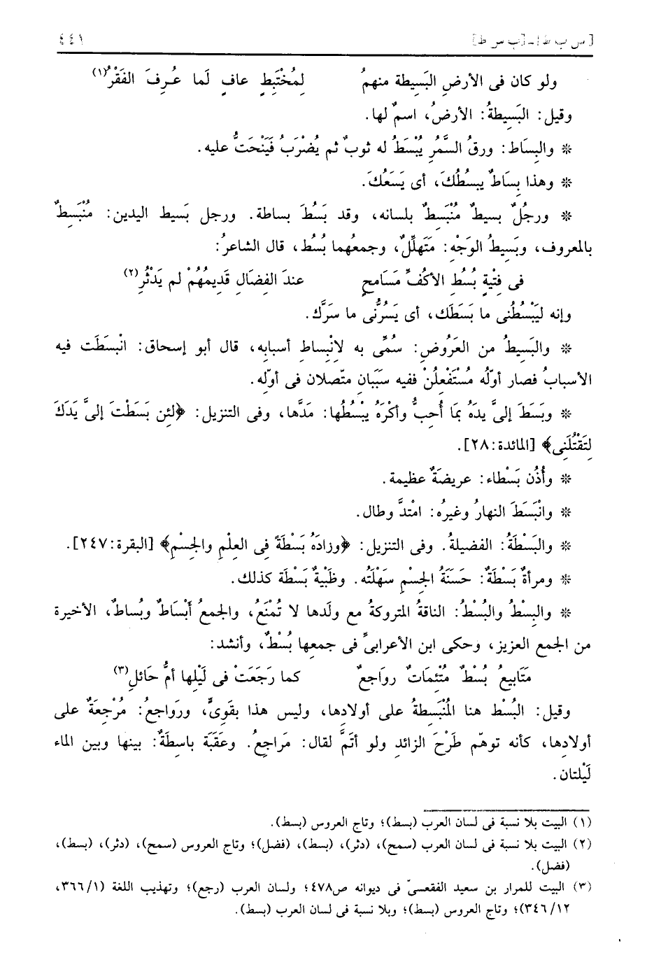 وإنه ليَبْسُطُني ما بَسَطَك أي يَسُرُّني ما سَرَّك والبَسِيطُ من العَرُوضِ سُمِّي به لانْبِساطِ أسبابِه قال أبو إسحاق انْبسَطَت فيه الأسبابُ فصار أوّلُه مُسْتَفْعِلُنْ ففيه سَبَبَانِ متّصلان في أوّلِه وبَسَطَ إليَّ يدَهُ بمَا أُحِبُّ وأكْرَهُ يبْسُطُها مَدَّها وفي التنزيل {لئن بسطت إلي يدك لتقتلني} المائدة 28 وأُذُن بَسْطاء عريضَةٌ عظيمة وانْبَسَطَ النهارُ وغيرُه امْتدَّ وطال والبَسْطَةُ الفضيلةُ وفي التنزيل {وزاده بسطة في العلم والجسم} البقرة 247 ومرأةٌ بَسْطَةٌ حَسَنَةُ الجِسْمِ سَهْلَتُه وظَبْيةٌ بَسْطَة كذلك والبِسْطُ والبُسْطُ الناقةُ المتروكةُ مع ولَدها لا تُمْنَعُ والجمعُ أَبْسَاطٌ وبُساطٌ الأخيرة من الجمع العزيز وحكى ابن الأعرابيِّ وفي جمعِها بُسْطٌ وأنشد
