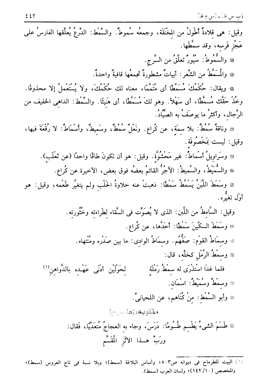 وقيل هي قِلادةٌ أَطْولُ من المِخْنَقَة وجمعُه سُموطٌ والسِّمْط الدِّرعُ يُعلِّقها الفارسُ على عَجُزِ فَرسِه وقد سمَّطَها والسُّمُوطُ سُيُورٌ تعلَّقُ من السَّرجِ والمُسَمَّطُ من الشِّعر أبياتٌ مشطورةٌ تجمعُها قافيةٌ واحدةٌ ويقال حُكْمُكَ مُسَمَّطاً أي مُتَمَّماً معناه لك حُكْمُكَ ولا يُسْتَعْملُ إلا محذوفاً وخُذْ حَقَّك مُسمَّطاً أي سَهْلاً وهو لكَ مُسَمَّطاً أي هَنِيئاً والسِّمْط الداهِي الخفيف من الرِّجالِ وأكثرُ ما يوصَفُ به الصَّيَّادُ وناقةٌ سُمُطٌ بلا سِمَةٍ عن كُراع ونَعْلٌ سُمُطٌ وسَمِيطٌ وأَسْمَاطٌ لا رُقْعَةَ فيها وقيل ليست بمَخْصُوفَةٍ وسَراوِيلُ أسْماطٌ غير مَحْشُوَّةٍ وقيل هو أن تكونَ طاقاً واحداً عن ثعْلَبٍ والسُّمَيْطُ والسميطُ الآجرُّ القائم بعضه فوق بعض الأخيرة عن كُراع وسمط اللَّبَنُ يَسْمُطُ سَمْطاً ذهبتْ عنه حلاوةُ الحَلْبِ ولم يتغيَّر طَعْمه وقيل هو أوّل تغيُّره وقيل السَّامِطُ من اللَّبن الذي لا يُصَوِّت في السِّقاء لِطَراءتِه وخُثُورتِه وسَمَطَ السكِّينَ سَمْطاً أَحَدَّها عن كُراع وسِمَاطُ القوْم صَفُّهُم وسِمَاطُ الوادِي ما بين صَدْره ومُنْتهاه وسِمْطُ الرَّمْلِ كخلِّهِ قال