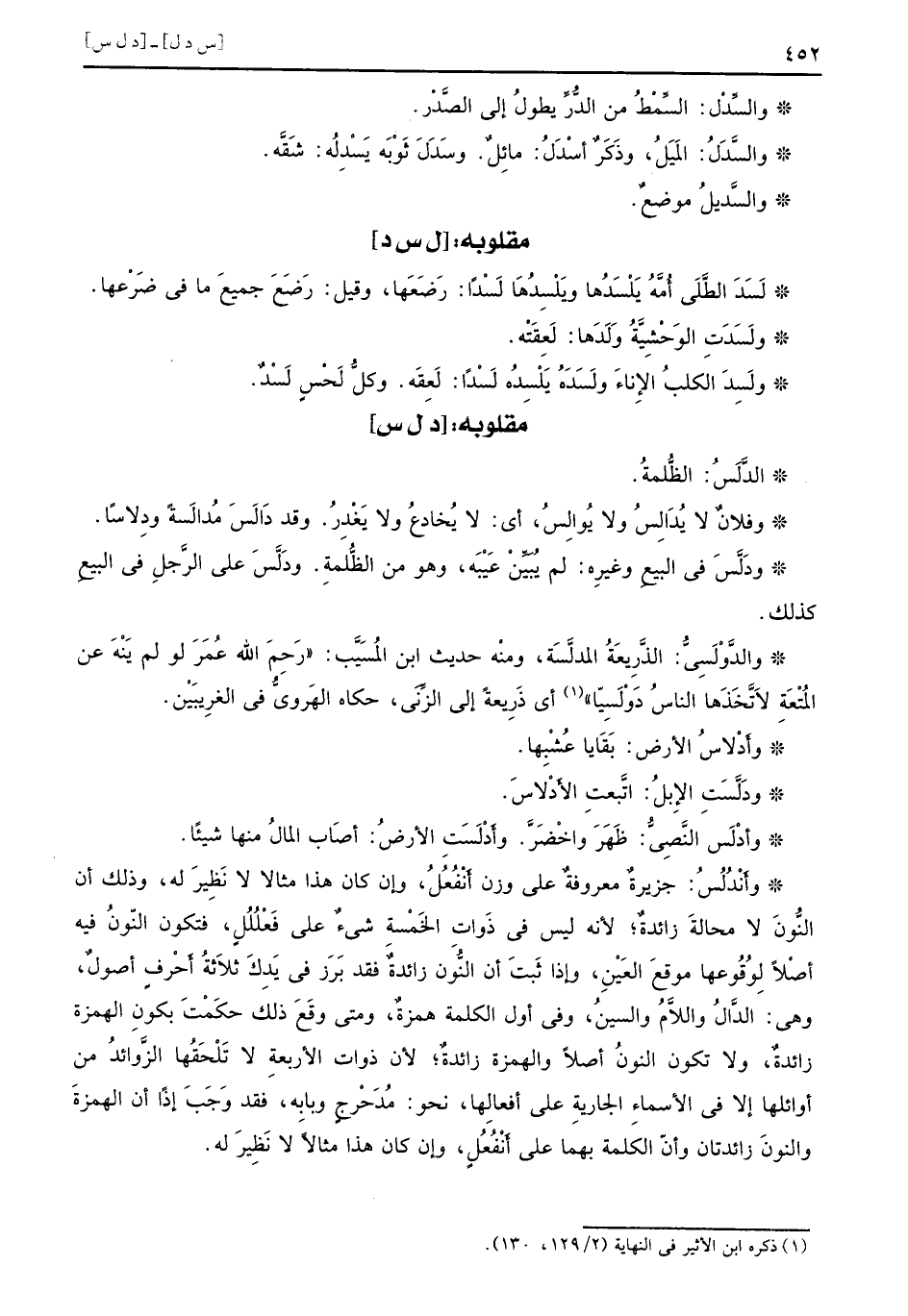 الدَّلَسُ الظُّلمةَ وفلانٌ لا يُدَالِسُ ولا يُوالِسُ أي لا يُخادعُ ولا يَغْدِرُ وقد دَالَسَ مُدالسَةً ودِلاساً ودَلَّسَ في البيعِ وغيرِه لم يُبَيِّنْ عِيْبَه وهو من الظُّلمةِ ودَلَّسَ على الرَّجلِ في البيعِ كذلك والدَّوْلَسِيُّ الذَّرِيعَةُ المدلَّسَة ومنْه حديث ابن المُسَيَّب رَحِمَ الله عُمَرَ لو لم يَنْهَ عن المُتْعَةِ لاَتَّخَذَها الناسُ دَوْلَسِيّا أي ذَرِيعةً إلى الزَّنَى حكاه الهَرويُّ في الغرِيبَيْن وأَدْلاسُ الأرض بَقَايا عُشْبِها ودَلَّسَتِ الإِبلُ اتَّبعتِ الأَدْلاسَ وأدْلسَ النَّصِيُّ ظَهَرَ واخْضَرَّ وأَدْلَسَتِ الأرضُ أصَاب المالُ منها شيئاً وأَنْدُلُسُ جزيرةٌ معروفةٌ على وزن أَنْفُعُلُ وإن كان هذا مثالا لا نَظِيرَ له وذلك أن النُّونَ لا محالةَ زائدةٌ لأنه ليس في ذَواتِ الخَمْسةِ شيءٌ على فَعْلُلُلٍ فتكون النّونُ فيه أصْلاً لِوُقُوعها موقعَ العَيْنِ وإذا ثَبتَ أن النُّون زائدةٌ فقد بَرَز في يَدِكَ ثلاَثةُ أَحْرفٍ أصولٌ وهي الدَّالُ واللاَّمُ والسينُ وفي أول الكلمة همزةٌ ومتى وقَعَ ذلك حكَمْتَ بكونِ الهمزة زائدةٌ ولا تكون النونُ أصلاً والهمزة زائدةٌ لأن ذوات الأربعةِ لا تَلْحَقُها الزَّوائدُ من أوائلها إلا في الأسماءِ الجاريةِ على أفعالِها نحو مُدَحْرجٍ وبابِه فقد وَجَبَ إذاً أن الهمزةَ والنونَ زائدتان وأنّ الكلمة بهما على أَنْفُعُلٍ وإن كان هذا مثالاً لا نَظِيرَ له
