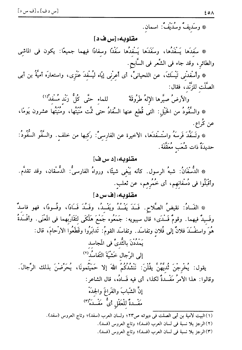 سَفِدَها يَسْفَدُها وسَفَدَها يَسْفِدُها سَفْداً وسِفاداً فيهما جميعاً يكون في الماشِي والطائِر وقد جاء في الشِّعر في السَّابِحِ وأَسْفدْنِي تَيْسَكَ عن اللحيانيِّ أي أَعِرْنِي إيّاه ليُسْفِدَ عَنْزِي واستعارَه أميَّةُ بن أبي الصَّلْتِ للزَّنْدِ فقال