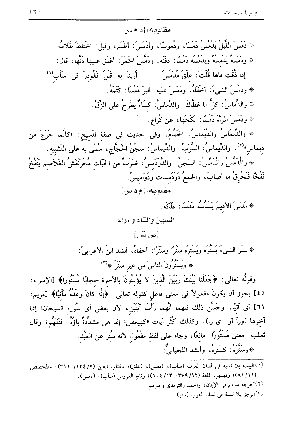 وقولُه تعالى {جعلنا بينك وبين الذين لا يؤمنون بالآخرة حجابا مستورا} الإسراء 45 يجوز أن يكون مفعولاً في معنى فاعلٍ كقوله تعالى {إنه كان وعده مأتيا} مريم 61 أي آتِياً وحَسَّن ذلك فيهما أنَّهما رَأْسَا آيَتَيْنِ لأن بعضَ آي سُورةِ سبحان إنما آخِرها ورآ أو ي رآ وكذلك أكْثَر آيات كهيعص إنما هي مشدَّدةٌ ياؤُهُ فَتفَهَّم وقال ثعلب معنى مَسْتُوراً مانِعاً وجاء على لفظِ مفْعُولٍ لأنه سُتِر عن العَبْدِ وسَتَّرَهُ كسَتَرَهُ وأنشد اللحيانيُّ