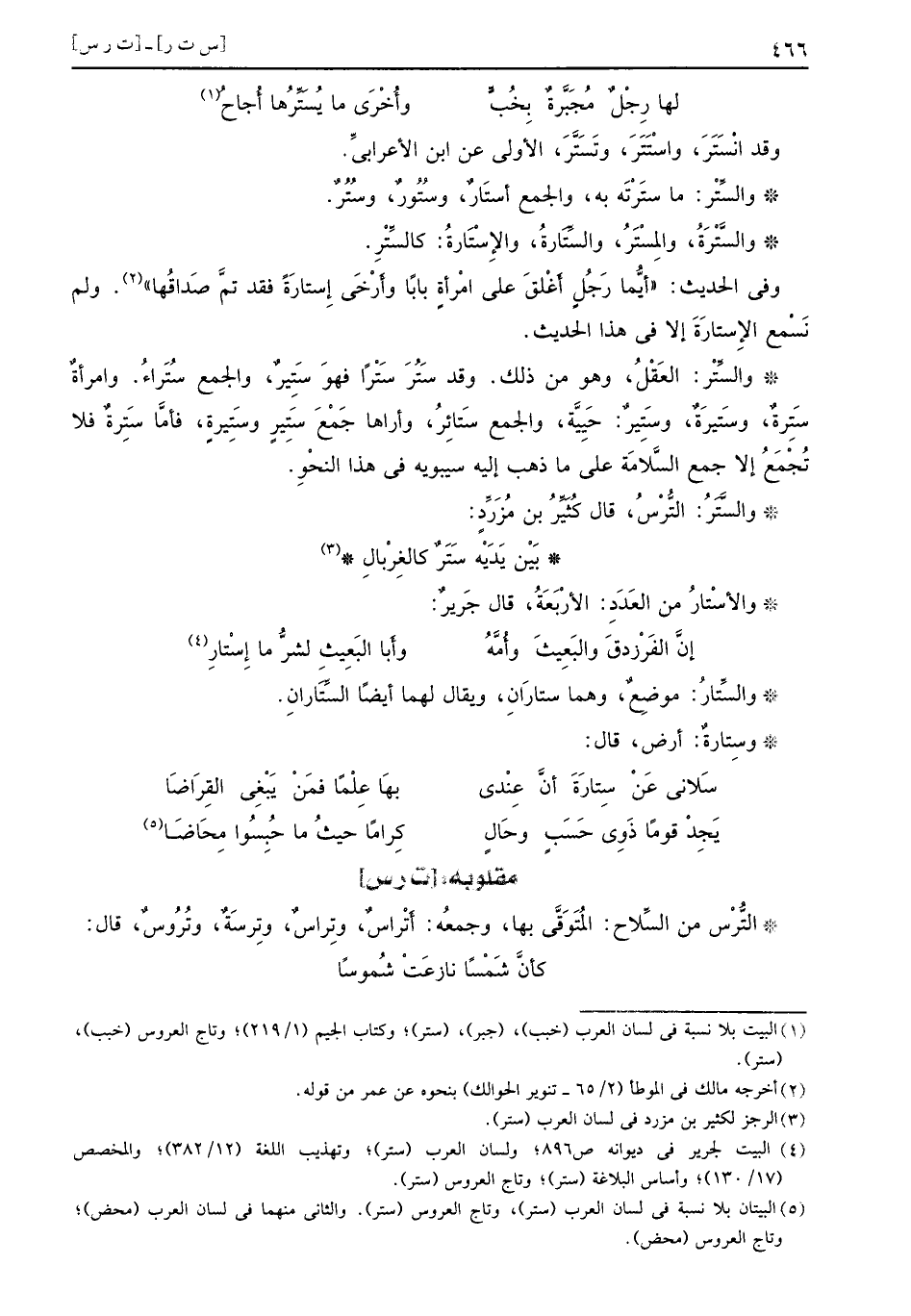 أيُّما رَجُلٍ أَغْلقَ على امرأةٍ باباً وأَرْخَى إِسْتارَةً فقد تمَّ صَداقُها ولم نَسْمع الإِستارَةَ إلا في الحديث والسِّتْر العَقْلُ وهو من ذلك وقد سَتُرَ سَتْراً فهوَ سَتِيرٌ والجمع سُتَراءُ وامرأةٌ سَتِرةٌ وسَتيرَةٌ وسَتِيرٌ حَيِيَّة والجمع سَتائِرُ وأراها جَمْعَ سَتِيرٍ وسَتِيرةٍ فأمَّا سَتِرةٌ فلا تُجْمَعُ إلا جمع السَّلامَة على ما ذهب إليه سيبويه في هذا النحوِ والسَّتَرُ التُّرْسُ قال كُثَيِّرُ بن مُزَوِّدٍ