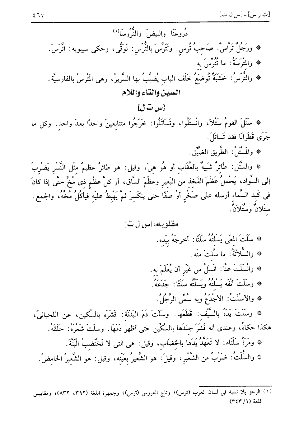 سَتَلَ القومُ سَتْلاً وانْستَلُوا وتَسَاتَلُوا خَرَجُوا متتابِعينَ واحداً بعدَ واحدٍ وكل ما جَرَى قَطَراناً فقد تَساتَلَ والمَسْتَلُ الطَّريق الضَّيِّق والسَّتَل طَائِرٌ شَبيهٌ بالعُقَابِ أو هُو هِيَ وقيل هو طائرٌ عظيمٌ مِثْل النَّسْرِ يَضْرِبُ إلى السَّواد يَحْملُ عَظْمَ الفَخِذِ من البَعِيرِ وعظْمَ السَّاق أو كلَّ عظْمٍ ذِي مُخٍّ حتَّى إذا كانَ في كَبِد السَّماءِ أرسله على صَخْرٍ أوْ صَفاً حتى ينكَسِرَ ثمَّ يَهْبِطُ عليهِ فيأكُلُ مُخَّهُ والجمع سِتْلانٌ وسُتْلاَنٌ