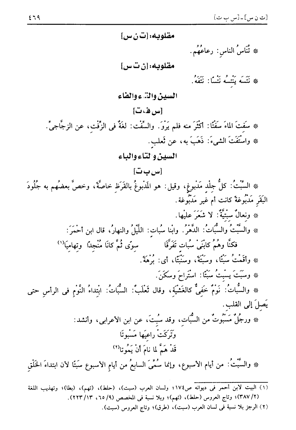 وأقَمْتُ سَبْتاً وسَبْتَةً وسَنْبَتاً أي بُرْهَةً وسَبَتَ يسْبِتُ سَبْتاً اسْتَراحَ وسَكَنَ والسُّباتُ نَوْمٌ خَفِيٌّ كالغَشْيَةِ وقال ثَعْلَبٌ السُّبَاتُ ابْتِداءُ النَّوْمِ في الرأسِ حتى يَصِلَ إلى القلبِ ورجُلٌ مَسْبُوتٌ من السُّبَاتِ وقد سُبِتَ عن ابن الأعرابيِّ وأنشد