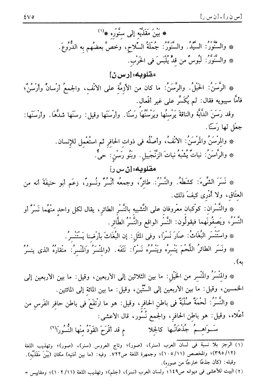 نَسَرَ الشَّيءَ كشَطَهُ والنَّسْرُ طائِرٌ وجمعُه أَنْسُرٌ ونُسورٌ زعَم أبو حنيفَةَ أنه من العِتَاقِ ولا أَدْرِي كيفَ ذلك والنَّسْرانِ كوْكبانِ معْروفانِ على التَّشبيهِ بالنَّسْرِ الطائرِ يقال لكل واحدٍ منْهُما نَسْرٌ أو النَّسْرُ ويَصِفُونَهما فيقولُون النَّسْر الواقع والنَّسْرُ الطَّائِر واسْتَنْسَر البُغَاثُ صَارَ نَسْراً وفي المَثَلِ إن البُغَاثَ بأرْضِنا يَسْتَنْسِرُ ونَسَر الطائُر اللَّحْمَ يَنْسِرُه ويَنْسُرُه نَسْراً نَتَفَه والمِنْسَرُ والمَنْسِرُ منْقارُهُ الذي ينسُرُ به والمِنْسَرُ والمَنْسِر من الخَيْلِ ما بين الثلاثين إلى الأربعين وقيل ما بين الأربعين إلى الخمسين وقيل ما بين الأربعين إلى السِّتِّين وقيل ما بين المائةِ إلى المائتين والنَّسْرُ لَحْمَةٌ صُلْبَةٌ في باطنِ الحافِرِ وقيل هو ما ارْتَفَعَ في باطن حافِر الفَرسِ من أعْلاه وقيل هو باطِن الحافرِ والجمعُ نُسُور قال الأعشى