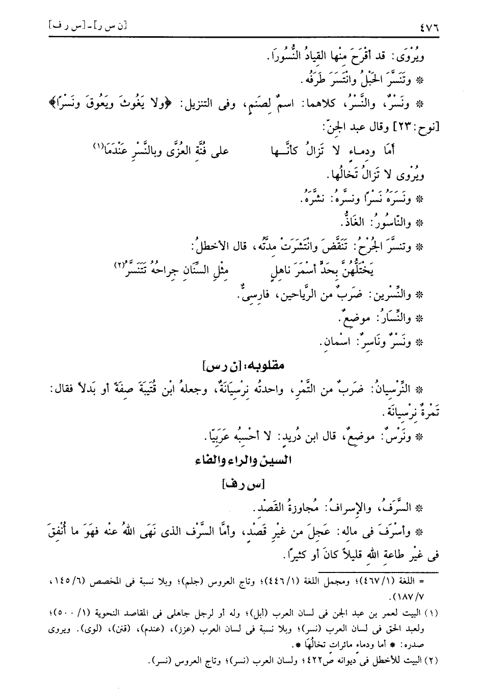 ويُرْوَى قد أقْرَحَ مِنْها القِيادُ النُّسُورَا وتَنَسَّرَ الحَبْلُ وانْتَسَرَ طَرَفُه ونَسْرٌ والنَّسْرُ كلاهما اسمٌ لِصَنمٍ وفي التنزيل {ولا يغوث ويعوق ونسرا} نوح 23 وقال عبد الجِنّ