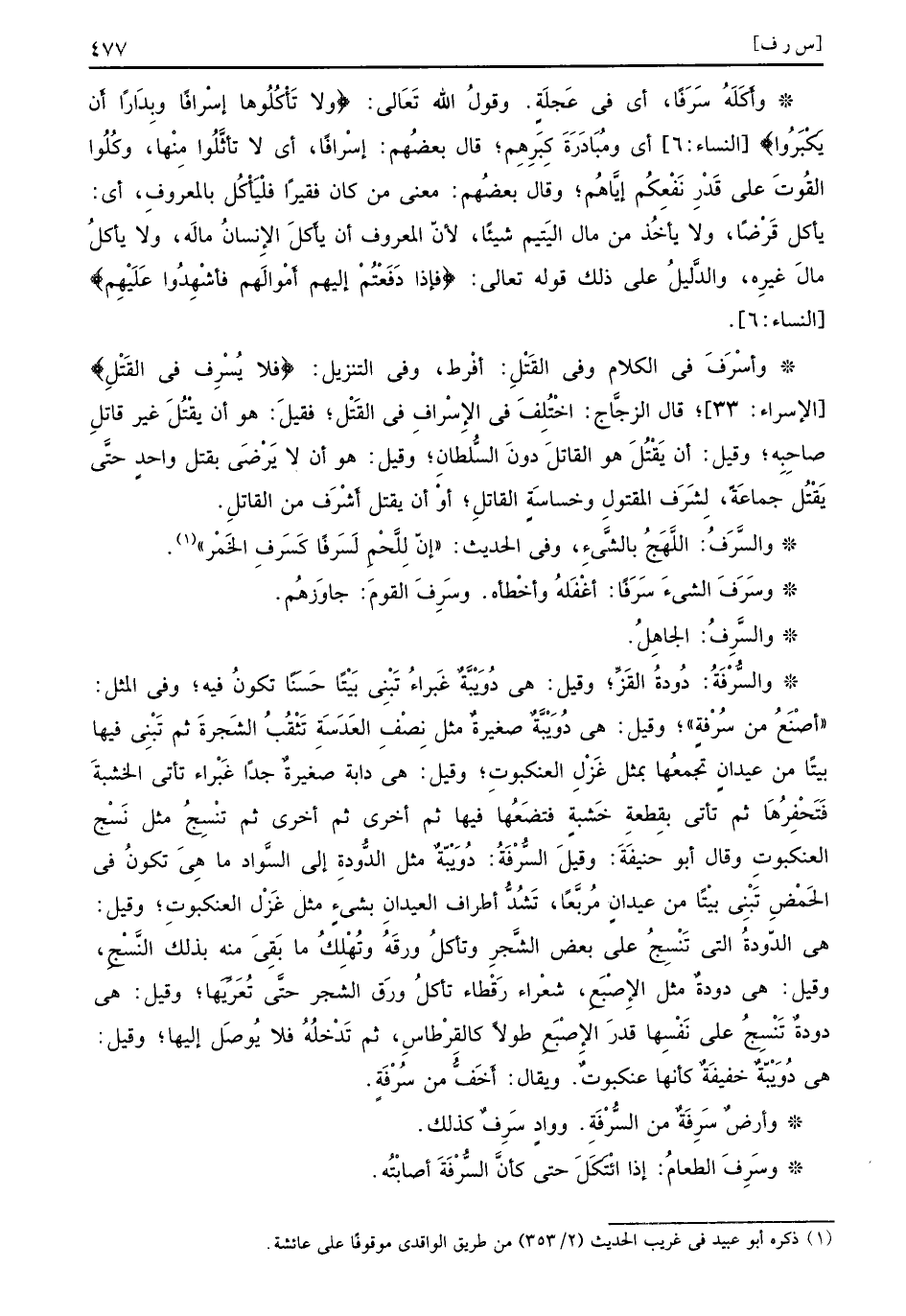 وأَكَلَهُ سَرَفاً أي في عَجلَةٍ وقولُ الله تَعَالى {ولا تأكلوها إسرافا وبدارا أن يكبروا} النساء 6 أي ومُبَادَرَةَ كِبَرِهِم قال بعضُهم إسْرافاً أي لا تأثَّلُوا مِنْها وكُلُوا القُوتَ على قَدْرِ نَفْعِكُم إيَّاهُم وقال بعضُهم معنى من كان فقيراً فلْيَأْكُل بالمعروفِ أي يأكل قَرْضاً ولا يأخُذ من مال اليَتيم شيئاً لأنّ المعروف أن يأَكلَ الإِنسانُ مالَه ولا يأكلُ مالَ غيره والدَّليلُ على ذلك قوله تعالى {فإذا دفعتم إليهم أموالهم فأشهدوا عليهم} النساء 6 وأسْرَفَ في الكلام وفي القَتْلِ أفْرط وفي التنزيل {فلا يسرف في القتل} الإسراء 33 قال الزجَّاج اخْتُلِفَ في الإِسْرافِ في القَتْل فقيلَ هو أن يقْتُلَ غير قاتلِ صاحِبِه وقيل أن يَقْتُلَ هو القاتلَ دونَ السُّلطانِ وقيل هو أن لا يَرْضَى بقتل واحدٍ حتَّى يَقْتُل جماعَةً لِشَرَف المقتول وخساسَةِ القاتلِ أو أن يقتل أَشْرَف من القاتلِ والسَّرَفُ اللَّهَجُ بالشَّيءِ وفي الحديث