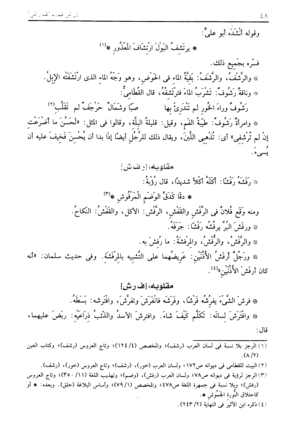 فسّره بجَمِيع ذلك والرَّشْفُ والرَّشَفُ بَقِيَّةُ الماءِ في الحُوْضِ وهو وَجْهُ الماءِ الذي ارْتَشَفَتْه الإِبِلُ وناقةٌ رَشُوفٌ تَشْرَبُ الماءَ فترْتَشِفُهُ قال القُطَامِيُّ