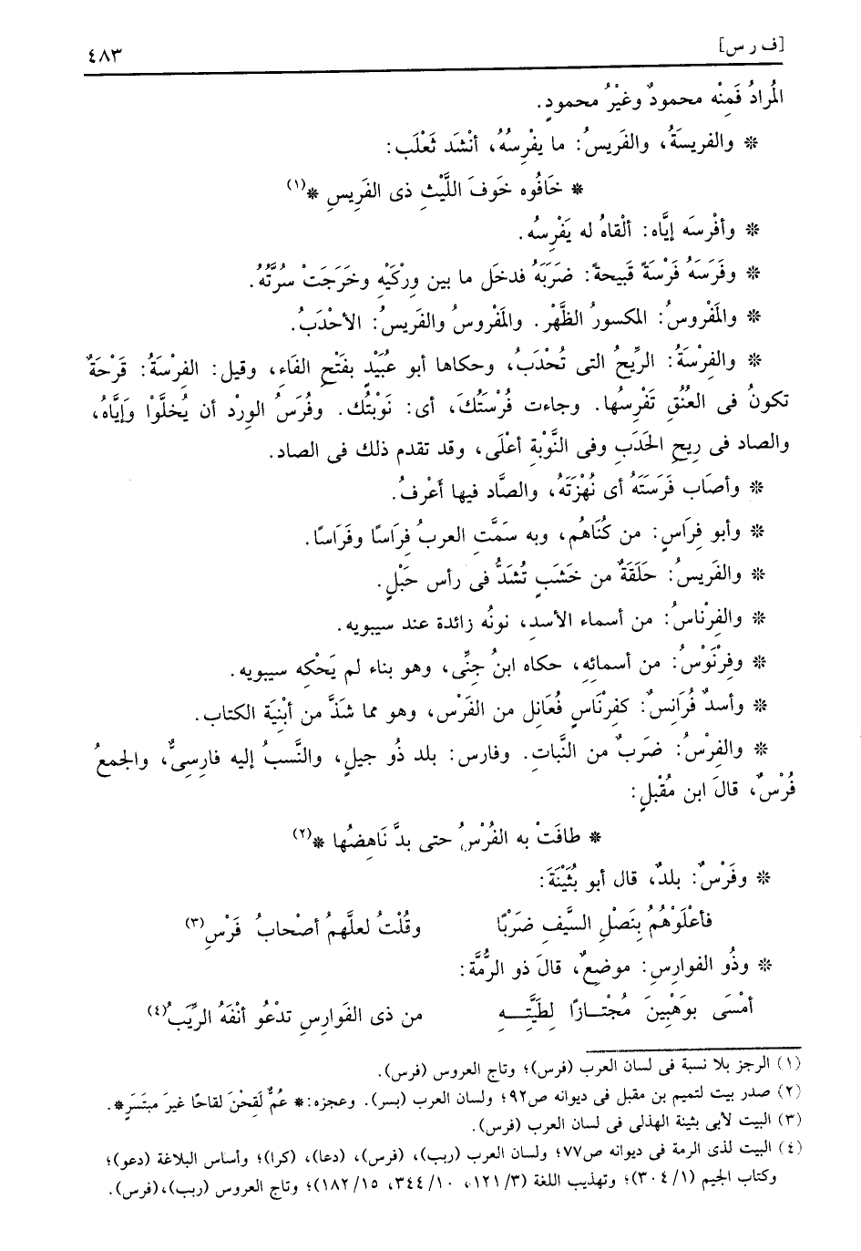 وأفْرسَه إيَّاه ألْقاهُ له يَفْرِسُه وفَرَسَهُ فَرْسَةً قَبيحةً ضَرَبَهُ فدخَل ما بين وِرْكَيْهِ وخَرَجَتْ سُرَّتُهُ والمَفْروسُ المكسورُ الظَّهْر والمَفْروسُ والفَريسُ الأحْدَبُ والفِرْسَةُ الرِّيحُ التي تُحْدَبُ وحكاها أبو عُبَيْدٍ بفَتْحِ الفَاءِ وقيل الفِرْسَةُ قَرْحَةٌ تكونُ في العُنُقِ تَفْرِسُها وجاءت فُرْسَتُكَ أي نَوْبتُك وفُرَسُ الوِرْد أن يُخلَّوا وَإيَّاهُ والصاد في رِيحِ الحَدَبِ وفي النَّوْبةِ أعْلَى وقد تقدم ذلك في الصاد وأصَاب فَرَسَتَهُ أي نُهْزَتَهُ والصَّاد فيها أَعْرفُ وأبو فِرَاسٍ من كُنَاهُم وبه سَمَّتِ العربُ فِرَاساً وفَرَاساً والفَريسُ حَلَقَةٌ من خَشَبٍ تُشَدُّ في رأس حَبْلٍ والفِرْناسُ من أسماء الأسدِ نونُه زائدة عند سيبويه وفِرْنَوْسُ من أسمائِهِ حكاه ابنُ جِنِّي وهو بناء لم يَحْكِه سيبويه وأسدٌ فُرَانِسٌ كفِرْنَاسٍ فُعَانِل من الفَرْس وهو مما شَذَّ من أبْنِيَة الكتاب والفِرْسُ ضَربٌ من النَّباتِ وفارس بلد ذُو جيلٍ والنَّسبُ إليه فارِسِيٌّ والجمعُ فُرْسٌ قالَ ابن مُقْبلٍ