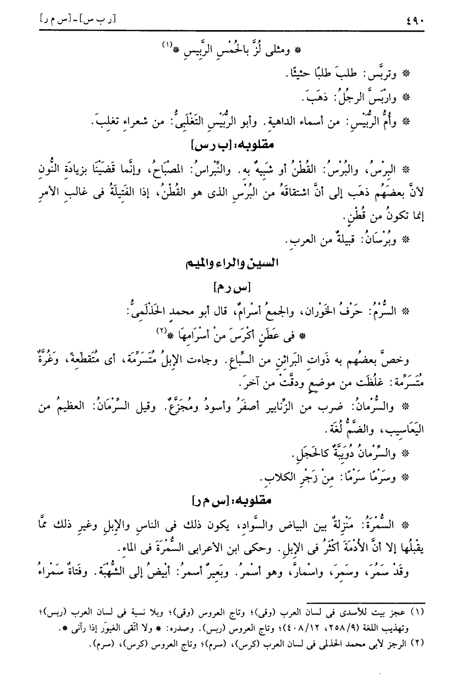 وخصَّ بعضُهم به ذَواتِ البَراثِنِ من السِّباعِ وجاءت الإِبلُ مُتَسَرِّمَة أي مُتَقطّعِةً وَغُرَّةٌ مُتَسَرِّمة غلُظَت من موضعٍ ودقَّتْ من آخَر والسُّرْمانُ ضرب من الزِّنابير أصفَرُ وأسودُ ومُجَزَّعٌ وقيل السِّرْمَانُ العظيمُ من اليَعَاسِيب والضَّمُّ لُغَة والسِّرْمانُ دُوَيِبَّةٌ كالحَجَلِ وسَرْماً سَرْماً مِنْ زَجْرِ الكلابِ